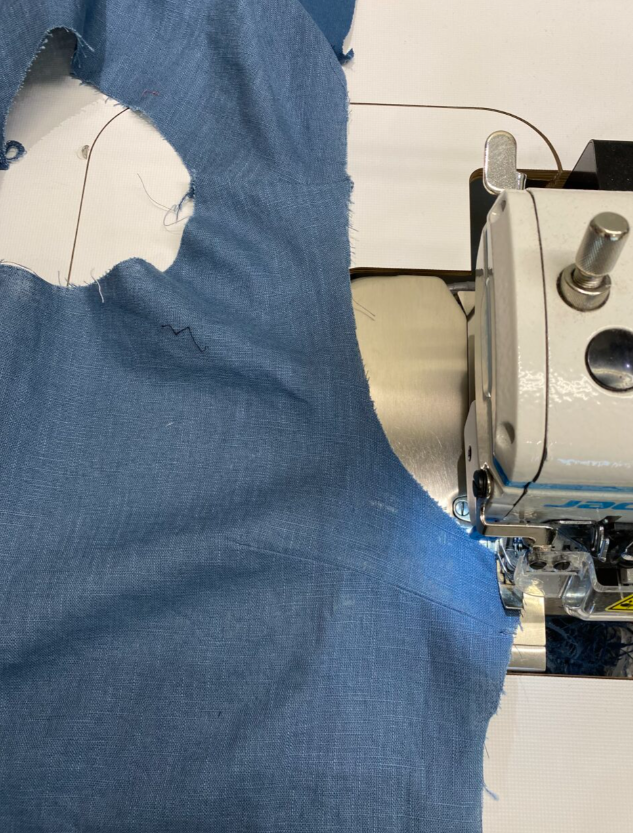 Kun tasku oli valmis, kiinnitimme hihat(5) saumurilla. Hihan hakit auttoivat kohdistamaan miehustaa, ja lopuksi mittasimme pääntien ja leikkasimme kaitaleet pääntiehen. Neulasimme kaitaletta alkuun ja loppuun. Ompelemme niin, että kaitale asettuu tasaisesti koko matkalle kohdistusten väliin, varoen venyttämästä miehustakangasta. Käänsimme kaitaleen nurjalle saumanvaran ympäri ja neulasimme kiinni huolellisesti. Ompelimme työn oikealta puolelta läheltä kantin reunaa. Kaksoisneulatikin voi ommella myös siten, että vain toinen neula kulkee kantin päällä ja toinen miehustan päällä.