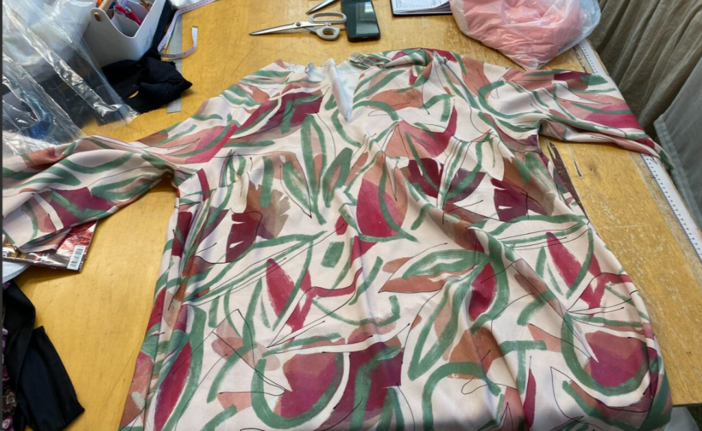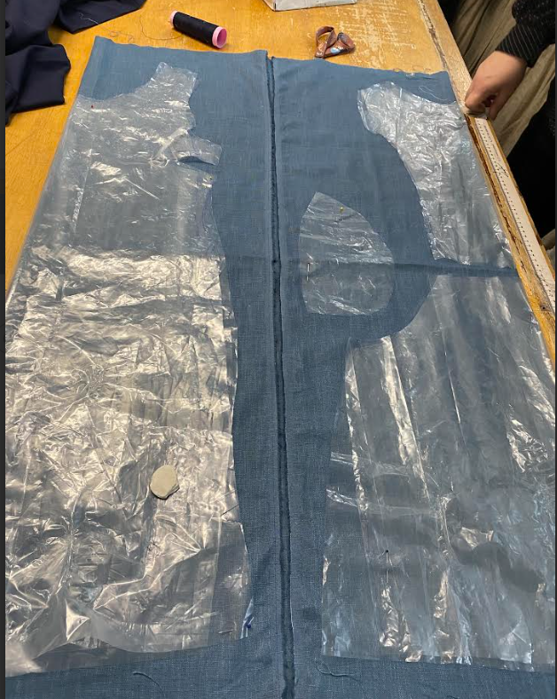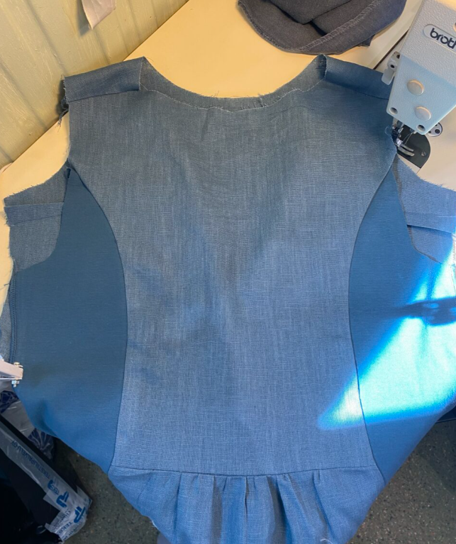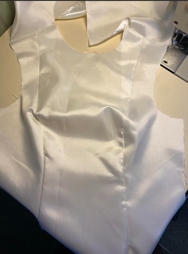 Proton tekeminen oli yllättävän helppoa, koska materiaali oli aina vuorikangasta. Nurjalla puolella oli aina kiiltävä pinta. Iina merkitsi mustekynällä muotolaskoksia ja hakkija. Sitten ompelin ne tarkasti muotolaskosten ohjeiden mukaan. Alussa oli hieman haastavaa, koska rinnan kohdalla oli terävä kulma, joka olisi pitänyt saada kaarevaksi. Muotolaskoksen ompelemisen jälkeen ompelimme etu- ja takakappaleet sekä olkasaumat yhteen, proton saumavara on aina 1cm. Käytimme vain tikkikonetta, emmekä saumuria. Tämän jälkeen silitimme työstä ja annoimme sen asiakkaalle kokeiltavaksi. Sinänsä tässä ei ollut mitään muuta.