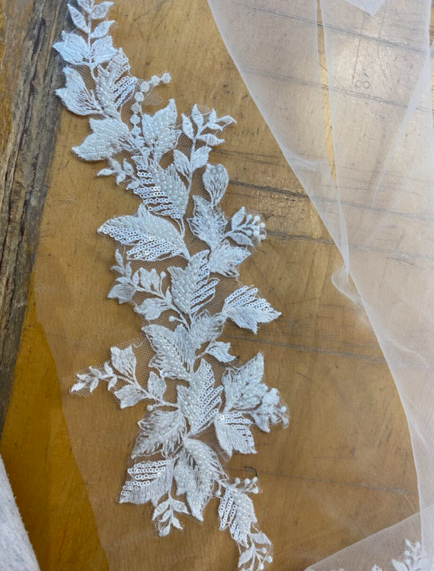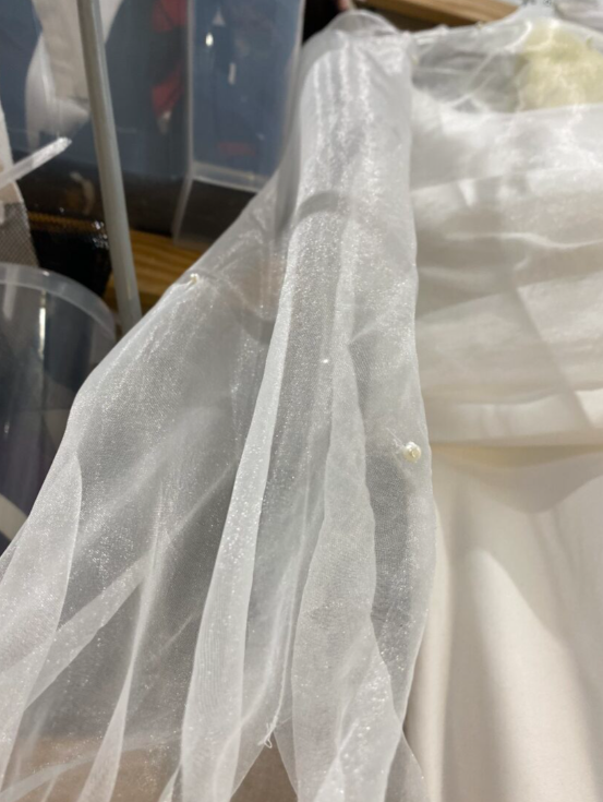 Olen myös ommellut häämekkoon korsetin luut ja tukinauhat sekä yhdistänyt yläosan ja helman. Olen käynyt läpi millitikkauksia, ja Iina on sanonut, että minulla sujuu hyvin niissä. Olen myös ommellut kevyeen tyllimaiseen boleroon pieniä helmiä. Helmien ompelu on tärkeää, koska niiden täytyy olla kunnolla kiristettyjä, jotta ne eivät ole löysiä ja tipu bolerosta. Boleron materiaali oli herkkä, joten sen kiinnittäminen oli hieman haastavaa, mutta onnistuin silti hyvin.