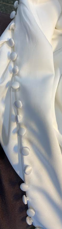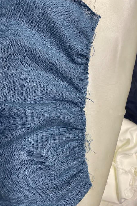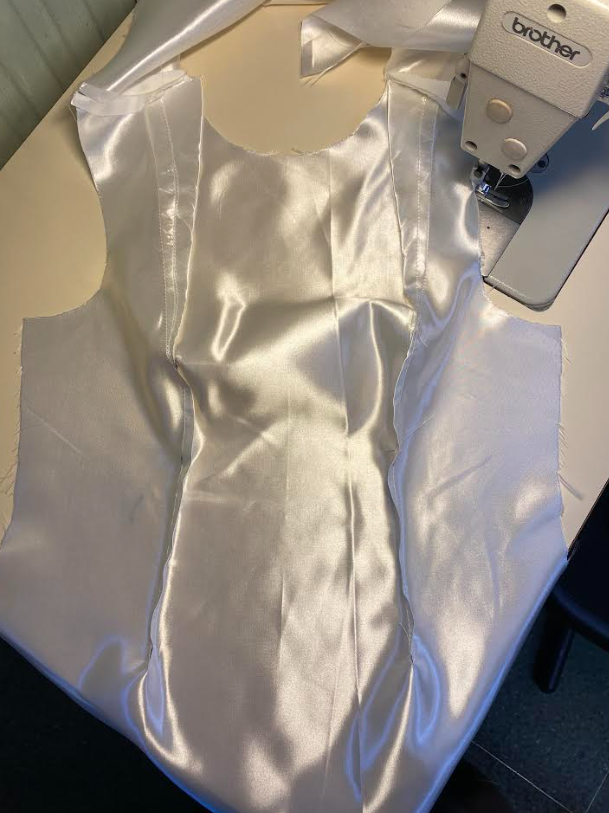 Ompelen käsin monia asioita, kuten kangasmerkkejä tyllihelmoihin ja kuppeja mekkoihin, kuppien ompelemisessa ommellaan vain alhaalta ja ylhäältä pieni määrä mekon rinnan kohdalle. Myös mekon taakse menevät rusetit kiinnitän käsin. Olen tehnyt nyörejä mekkojen korsetteihin ja auttanut mekkojen etu- ja takakappaleiden ompelussa yhteen. Saumavaroissa pitää olla aina tarkkana! Koska alussa oli vaikeata ilman mitään merkkejä ommella koneella.