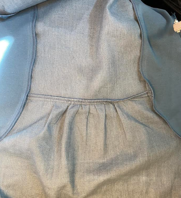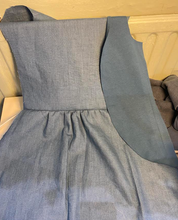 Iina leikkasi minulle helmakohtaan täyskellohameen muotoisen palan, ja minä ompelin sen yhteen muiden osien kanssa, jotta se näyttäisi oikealta hameelta. Poimutin myös vyötärön kohdan.