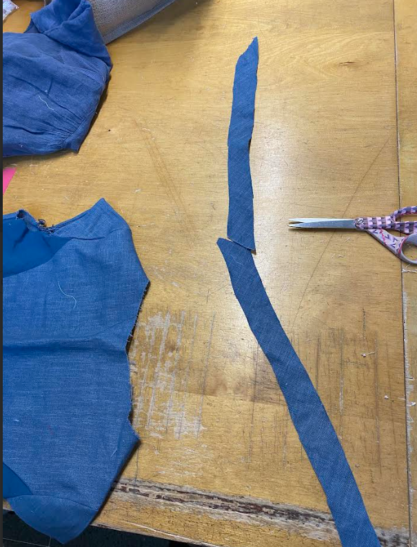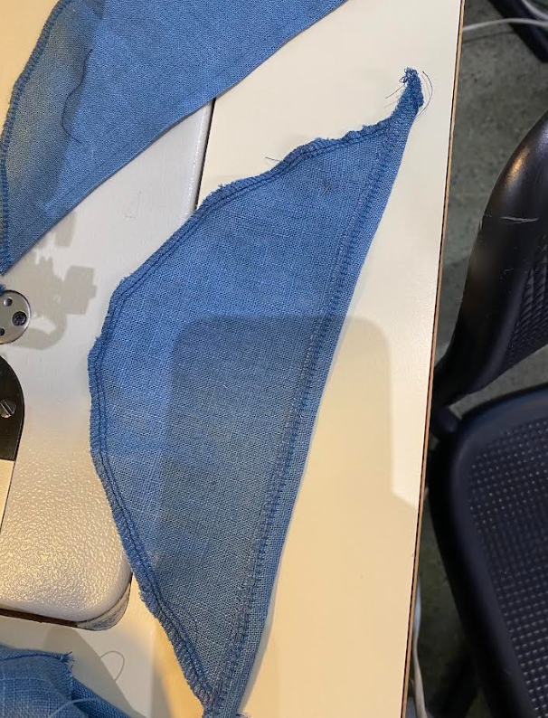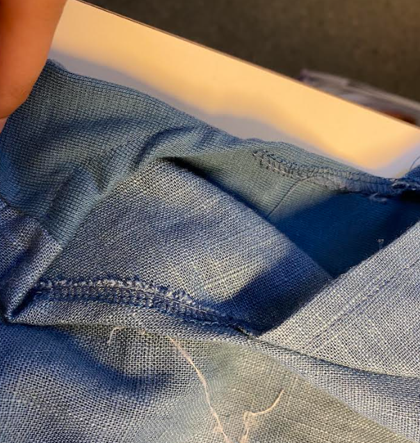 Seuraavaksi ompelimme olat yhteen ja huolittelimme takaosan saumurilla. Siirryimme etuosan taskuihin (4). Taskuja varten leikkasimme kaitaleet, jotka olivat 4 senttiä leveitä ja pituudella ei ollut väliä koska niitä leikataan lopussa. Kaitaletta ommeltiin etuosan taskunsuuhun samalla tavalla kuin vinokanttinauhaa ommeltaessa. Tässä samalla Saumuroitiin taskun ympäri(4) ja tikkasimme sen etuosaan kiinni niin että taskun hakit kohdistuu taskunsuun hakkeihin.