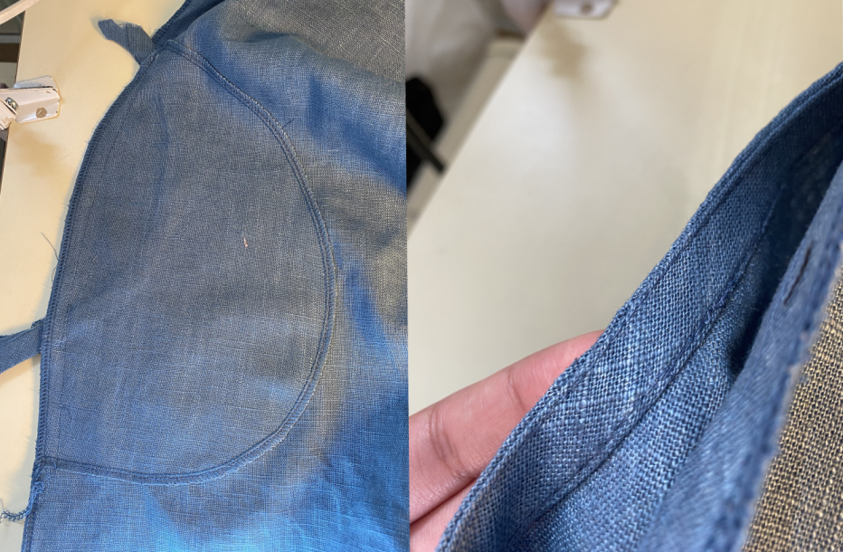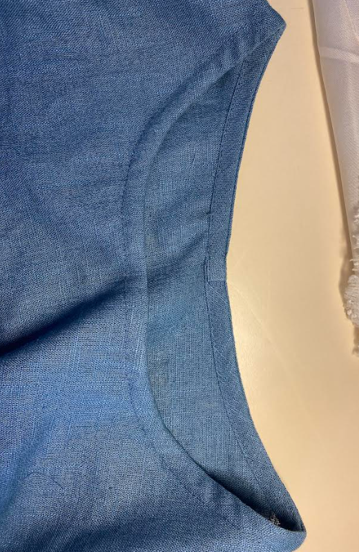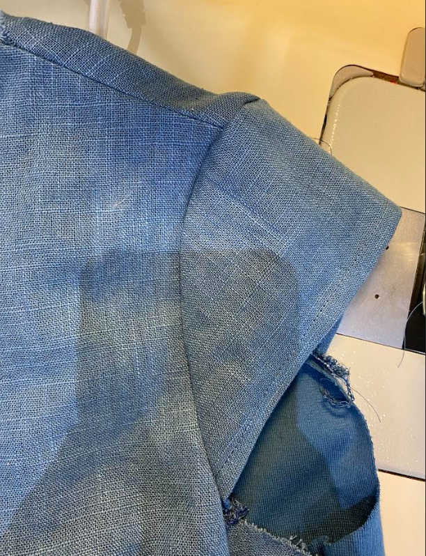 Leikkasimme ylimääräisen kankaan nurjalla puolella läheltä ommelta, mutta huolehdimme, ettei leikattu ommelta tai miehustankangasta. Kohdistimme avoimen reunan, neulasimme ja ompelimme raglansauman kiinni.