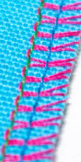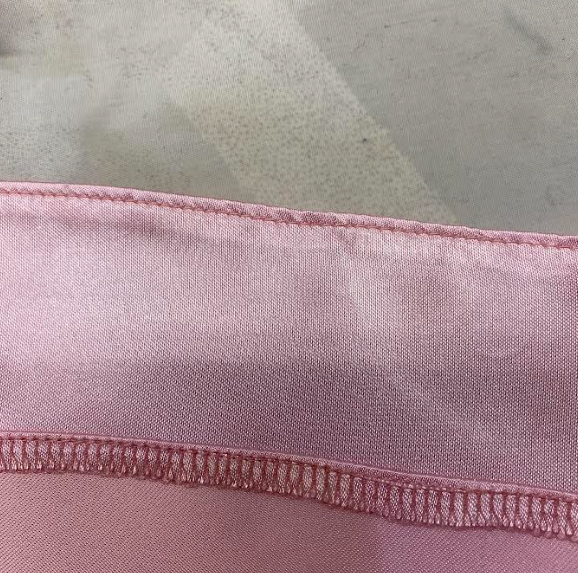 Hihoja(5) ei tarvitse saumuroida ympäri, vain sitä suoraa sivua pitää saumuroida. Käännä hihan käännevara nurjalle puolelle noin 1cm ja tikkaa oikealta puolelta 1cm.