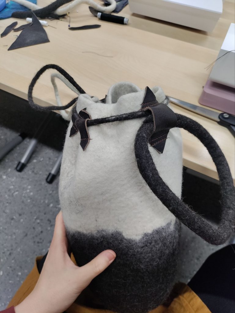 Piti miettiä, tahdonko kiinnittää pussukkaan sirkkoja vai kuinka ohjaan nyörin kulkemaan oikeassa kohdassa ilman suurempaa vaivaa. Päädyin käyttämään saamiani nahkapaloja.