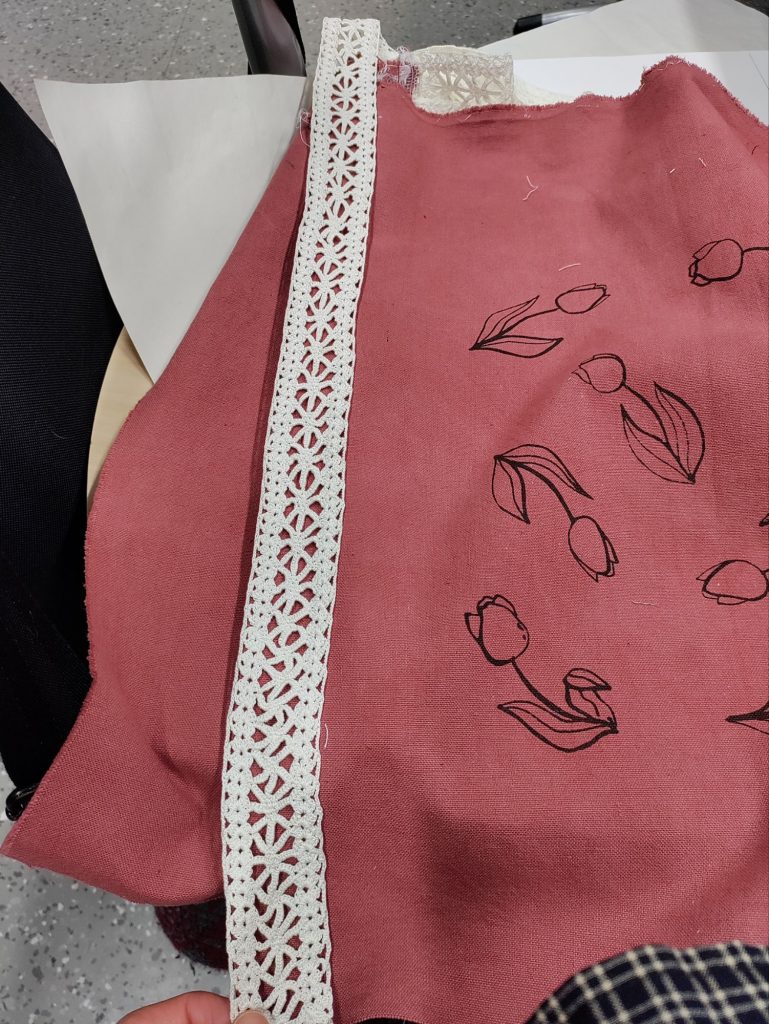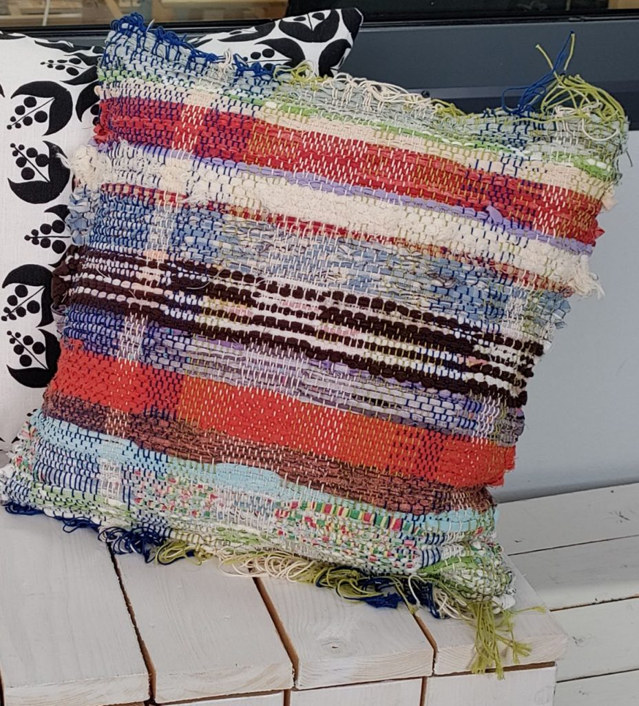 Tein itse kaavan ja sillä kaavalla valmistin 4 tyynyä. Kangas oli kirpputorilta ja nauhat oli koulukaverilta.