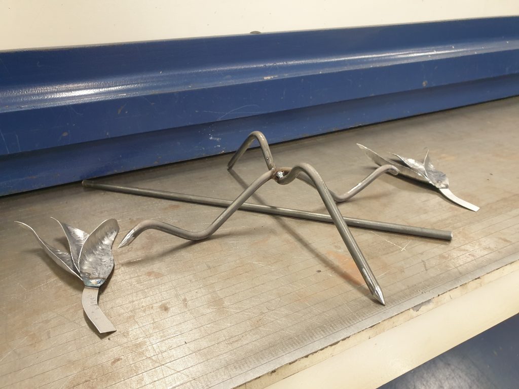 Suunnitelma oli valmis, kukan runko ja juuret valmistettaisiin terästangosta, varresta tulisi suora ja juurista mutkaiset rungon alle. Katkaisin sopivan mittaiset palat terästangosta runkoon sekä kaksi erillistä palaa juuriin metallivannesahalla. Sitten lähdin muotoilemaan juuria alasimeen asetettavan vääntöraudan avulla, muotoilin kaksi kappaletta terästankoja juuriksi. Halusin kuitenkin vielä juuriin lisää aitoutta ja ulkonäköä, joten teroitin vielä juurien päät hiomalla ne teräviksi.