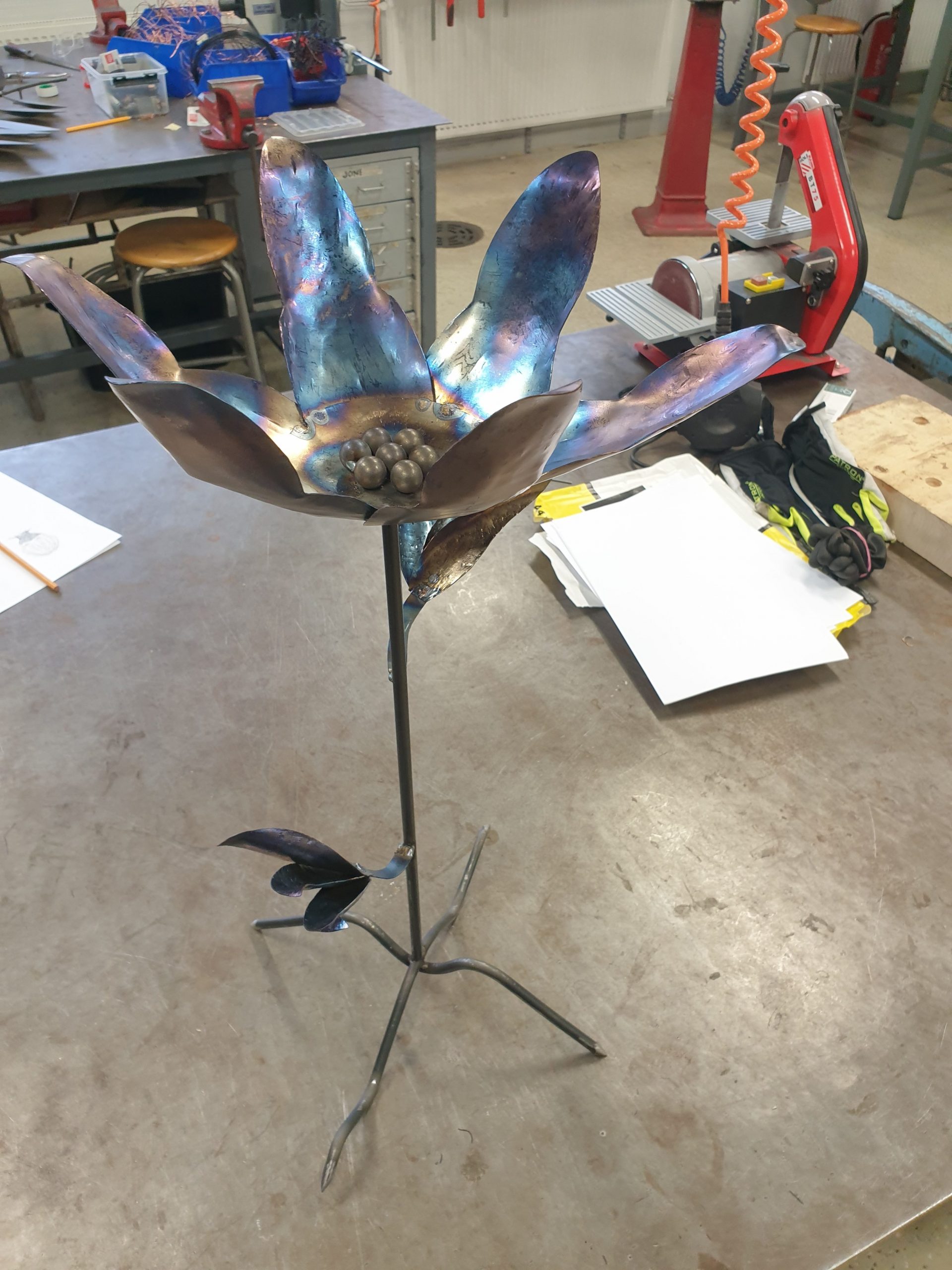 Työ eteni hyvää vauhtia ja seuraavaksi lähdinkin jo pistehitsaamaan. En ollut ikinä aiemmin hitsannut ja se tuntui jännittävältä. Aloitin hitsaamalla kukan varren lehdet kiinni niiden varsiin, varsia oli kaksi, joten lehtiä piti saada mahtumaan kolme yhtä vartta kohden. Varren lehdet olivat vaikea saada pysymään paikallaan piste hitsauksen ajan, joten käytin magneettia apuna osien paikalla pidossa. Sain lehdet hitsattua, jonka jälkeen aloitin suunnittelemaan, mitenkä hitsaan kukan terälehdet kiinni kukan keskustaan. Terälehtiä oli kuusi ja olisi ollut hyvin vaikeaa arvioida silmämääräisesti, mihin mikäkin terälehti tulee joten aloitin sillä, että jaoin keskustan kolmeen sektoriin. Tämän jälkeen oli paljon helpompi tietää, mihin mikäkin lehti tulisi ja Hitsasin jokaisen sektorin keskelle yhden lehden pistehitsillä, jonka jälkeen olikin jo helppoa hitsata loput kolme lehteä jäljelle jääneisiin aukkoihin.