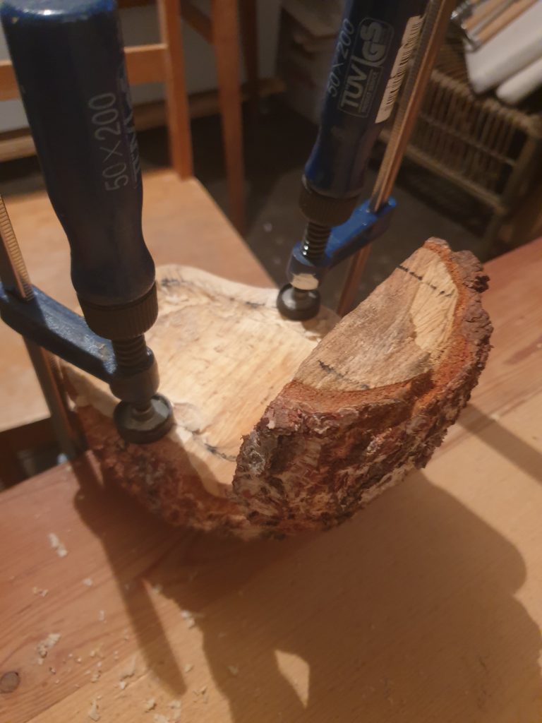 Tämän jälkeen minun piti alkaa muotoilemaan lehtiä sekä keskustaa. Muotoilussa oli vaihtoehtoina muotoilla osat pakotuskoneella tai käsin tukin sisällä vasaralla hakaten. Muotoilin kukan terälehdet sekä keskustan koneella oikeaan kaarevuuteen. Halusin kuitenkin, että kukka näyttäisi käsintehdyltä eivätkä lehdet olisi täydellisen tasaisia ja sileitä joten hakkasin vielä kaikki mutoillut osat käsin tukin sisällä lopullisiin muotoihinsa. Terälehdistä kuitenkin puuttui vielä tässä vaiheessa aitoutta, joten jatkoin vielä lehtien muotoilua mm alasinta hyväksi käyttäen.