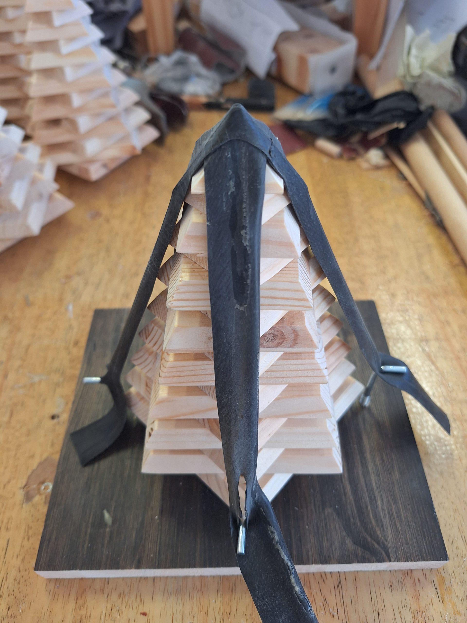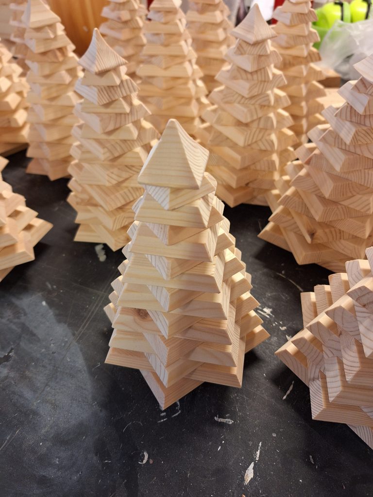 Kuusen materiaalina toimi mänty, joka tuotti omat haasteensa, sillä sitä sahatessa saha repi puusta palasia. Kuusen ideana oli siis se, että mun piti sahata neliön mutoisia kappaleita, joissa reunojen piti olla tiettyyn kulmaan sahattuna. Jonka jälkeen palaset piti asetella päällekkäin vuorotellen siten, että neliöt muodostivat tähden ylhäältä katsottuna. Erikokoisia neliöitä oli kahdeksaa eri kokoa, isoin oli 10cm halkasialtaan ja pienin 3cm. Jokaista kokoa tuli kaksi päällekkäin jonka jälkeen edettiin seuraavaan 1cm pienempään palaseen, tämän seurauksena palaset muodostivat kuusen näköisen teoksen. Kuusiin piti tehdä myös latvat ja pohjat. Kaiken kaikkiaan palasia yhtä kuusta kohden tuli siis 17, sillä 3cm palasia laitettiin päällekkäin vain yksi.