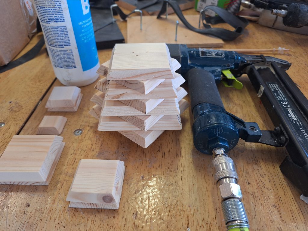 Seuraavaksi kuusia piti alkaa kasaamaan. Jokaisen kerroksen väliin tuli vähän liimaa, jonka jälkeen ne lyötiin vielä naulapyssyllä kiinni toisiinsa. Kuusen osat aseteltiin siten, että joka toisen kerroksen palasten syyt olivat samaan suuntaan, joka loi kivan ulkonäöllisen kontrastin.