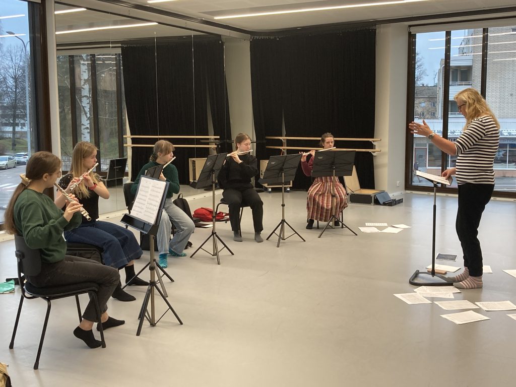Sirpa Berg ohjeistaa stemmiksissä Puhurin huilisteja.