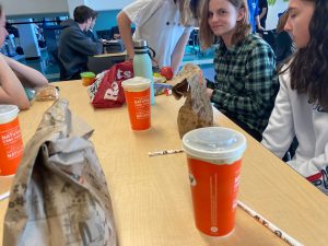 We ate lunch at Taylor’s house. It was some fish with potatoes and salad. In Calgary not many families eat fish for lunch. The fish was caught in the ocean because not many of the fishes are good in the ponds or rivers.