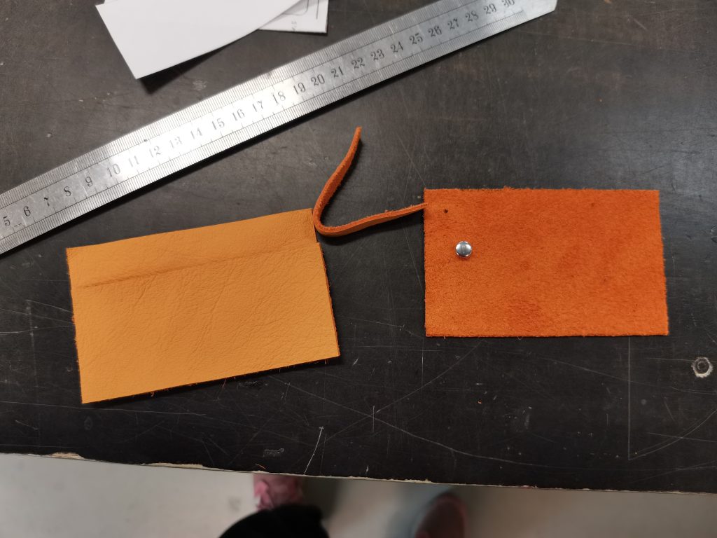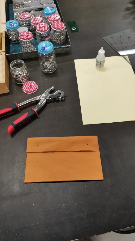 Aloitin ensimmäiseksi tekemään pientä kännykkälaukkua, johon tuli painonapit läppään sekä taakse purjerenkaat hihnaa varten.