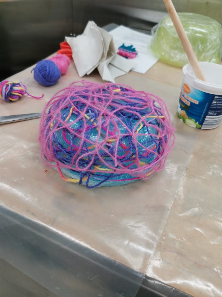 Lyhensin ja muotoilin saksilla lankoja viimeistelyksi. Ompelin työn pahvin ympärille.