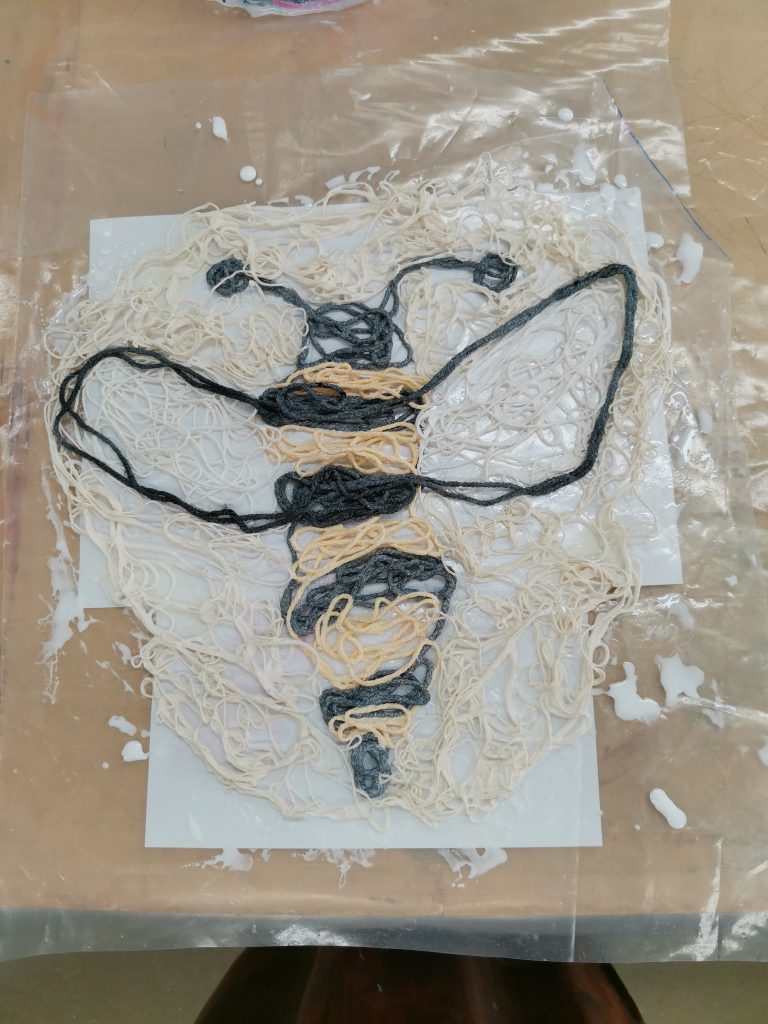 Sitten kokeilin liimavesi-seoksella kaaospunontaa tasona. Tein mallin avulla ampiaisen.