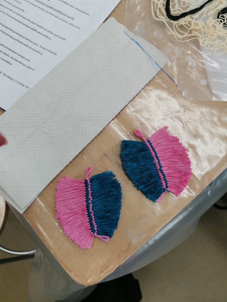 Päätin kovettaa viime keväänä harjoittelussa tekemäni makramee korvakorut.