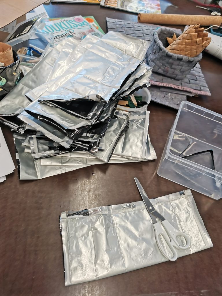 Seuraavaksi pesin ja ompelin kahvipusseista suikaleita.