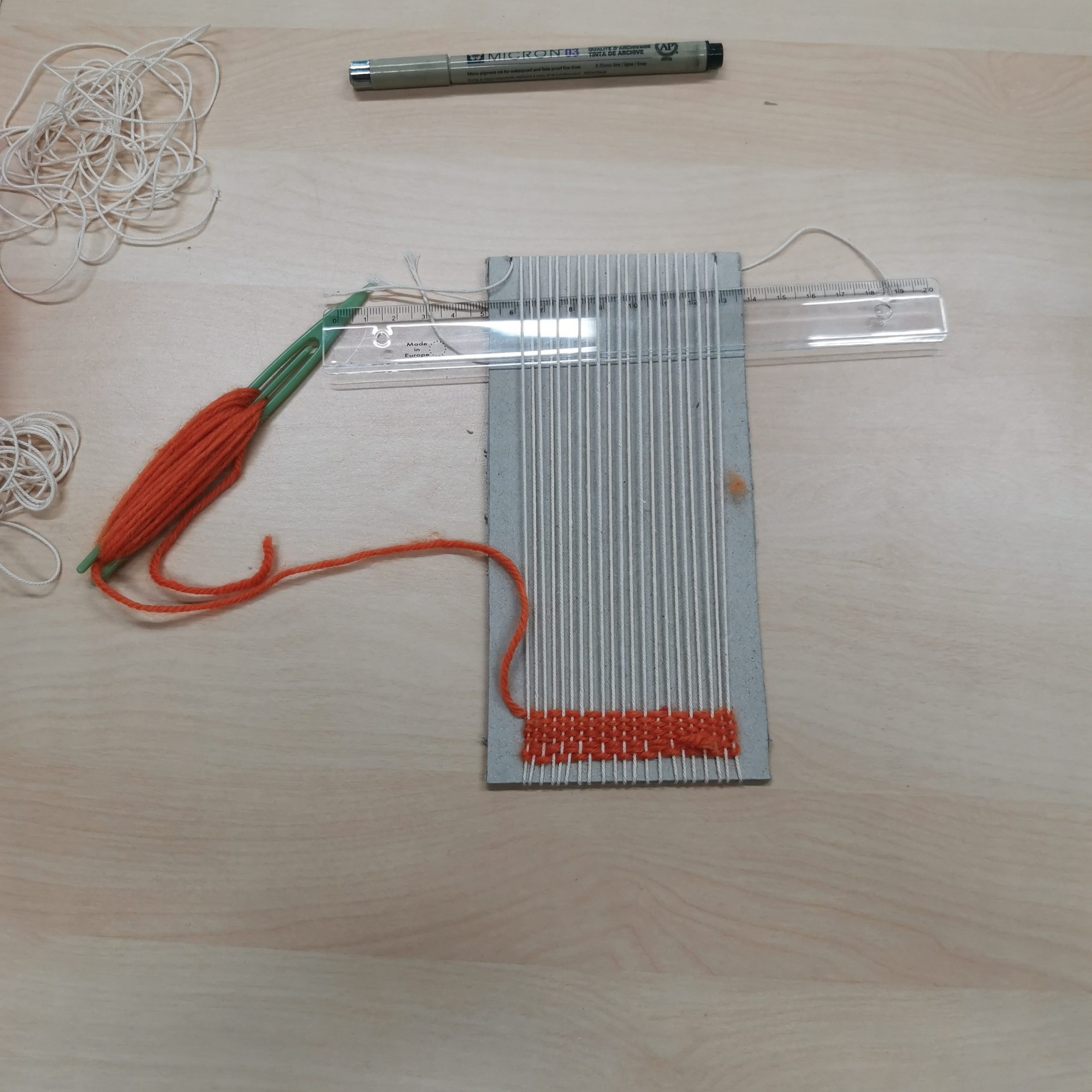 Ryijyn teko aloitettiin tekemällä pieni loimi pahvin palaan, johon sitten kudottiin pieni palttina alku. Loimea nostettiin viivaimen avulla ja lanka kudottiin käyttäen käpyä.
