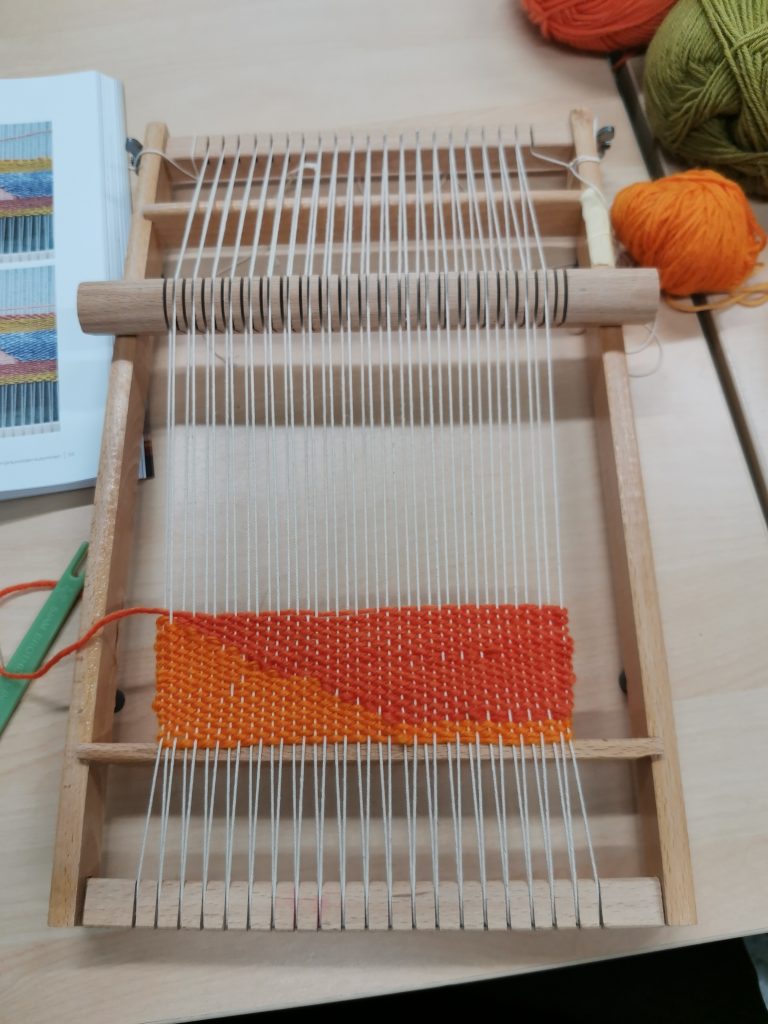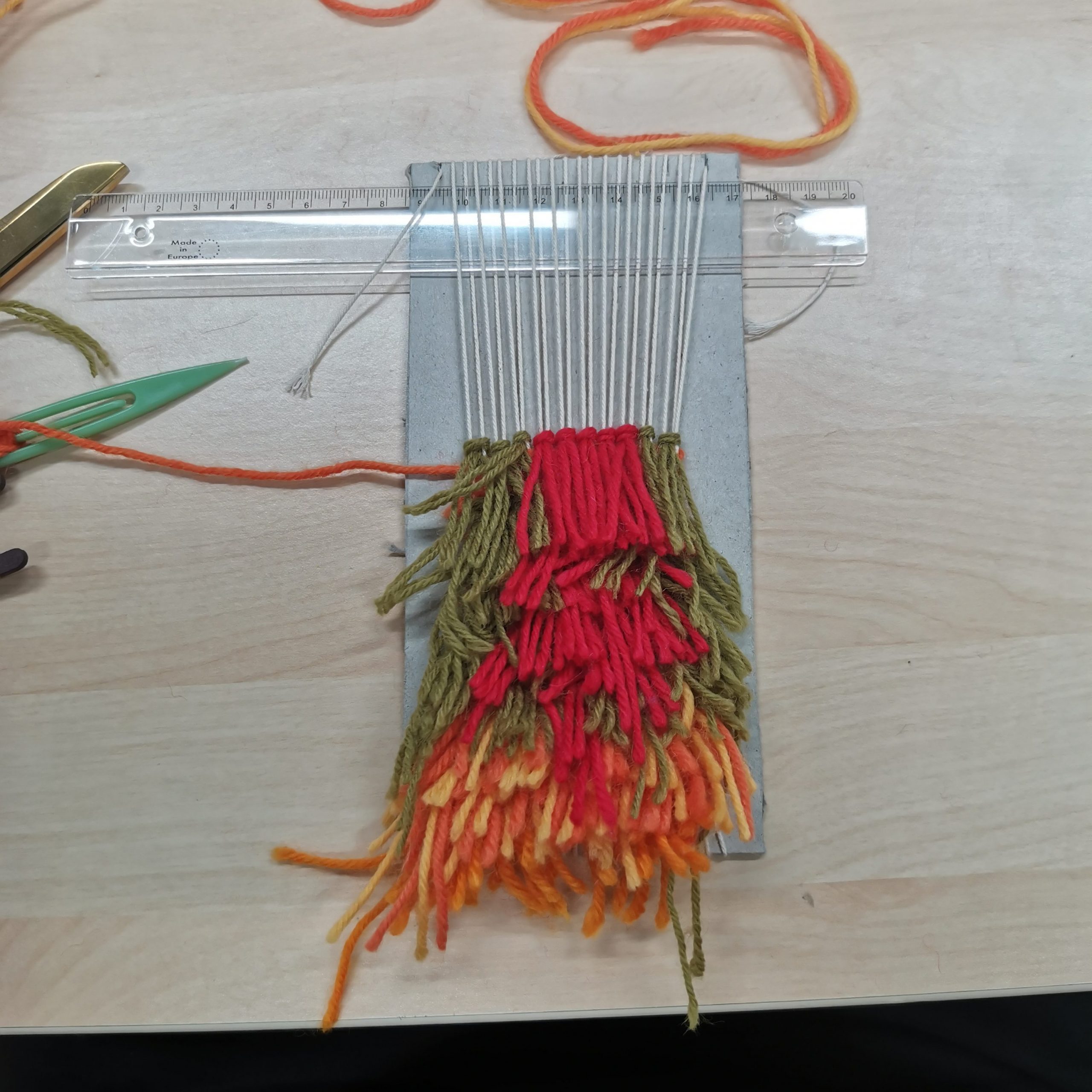 Seuraavaksi kokeilin ryijyn tekoa kangaspuilla. Tekniikka oli sama kuin pahvin kanssa tehdessä, mutta välineenä nyt vain kangaspuut.
