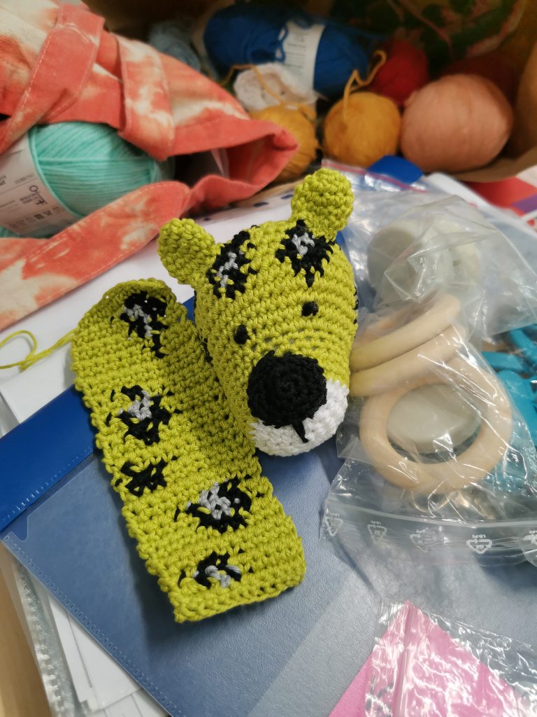 Seuraavaksi virkkasin helistimen, jossa kokeilin kuviovirkkausta ensimmäistä kertaa. Helistimen pää oli helppo tehdä, mutta tasona virkattu, helistin renkaan ympärille tuleva osa, oli hieman haastava. Valmista kuitenkin tuli ja pidän kovasti lopputuloksesta! Vielä pitäisi löytää oikean kokoinen helistinrengas työhön.