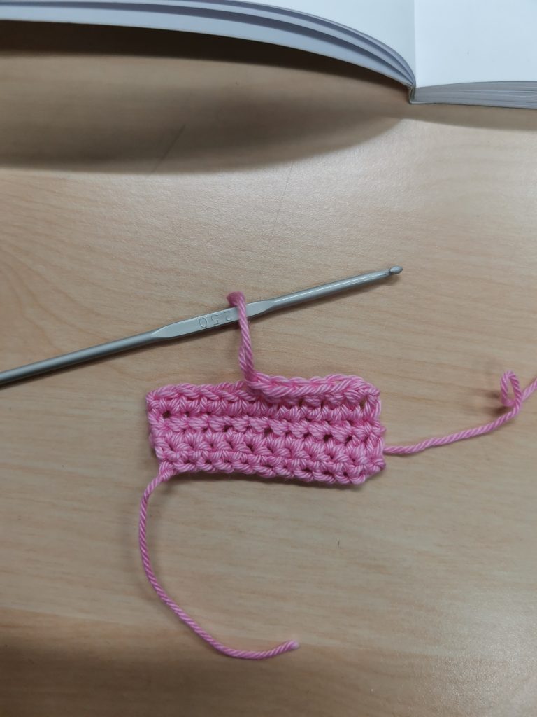 Seuraavaksi kokeilin rapuvirkkausta. Olen vasenkätinen joten työssä vasemmassa reunassa on kiinteät silmukat minulle normaalilla tavalla ja oikeassa reunassa rapuvirkkaus tyylillä. Rapuvirkkaus oli hauska opetella ja totesin siitä olevan hyötyä esimerkiksi tasona virkattavassa kuviovirkkauksessa, koska lanka näin kulkee koko ajan työn nurjalla puolella.