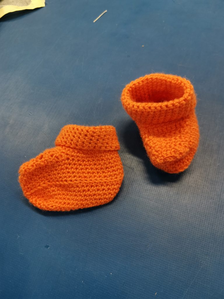 Aloitin virkkaamalla vauvan tossut. Näiden ohje oli mielestäni huono, sillä siinä oli paljon kohtia, joita oli vaikea tulkita, eikä virkkaajalle annettu esimerkiksi valmiita silmukkamääriä. Tossuista kuitenkin tuli valmista.