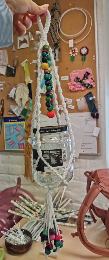 Makramee amppeli tuli pyyntönä toisilta ohjaajilta ja saimme viikon aikana valmistettua niitä melkein 10 kappaletta. Nämä amppelit tulevat koristamaan Wari ry:n toimipistettä.