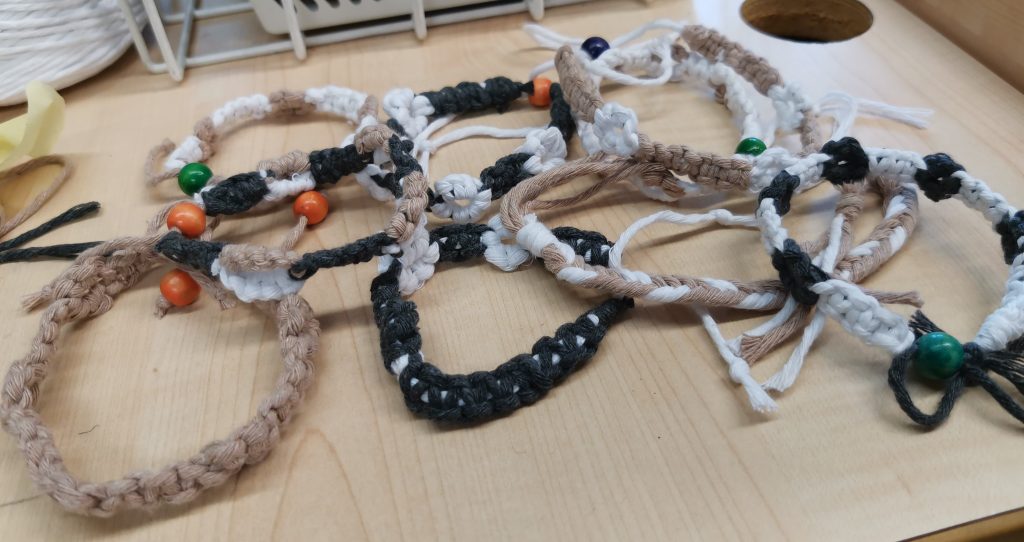 Makramee oli myös suurimmalle osalle uusi tekniikka. Oli ihanaa nähdä kuinka syntyi valmiin kukkakäsikoru-mallin lisäksi myös muita erilaisia käsikoruja, joita koristeltiin sitten helmin.