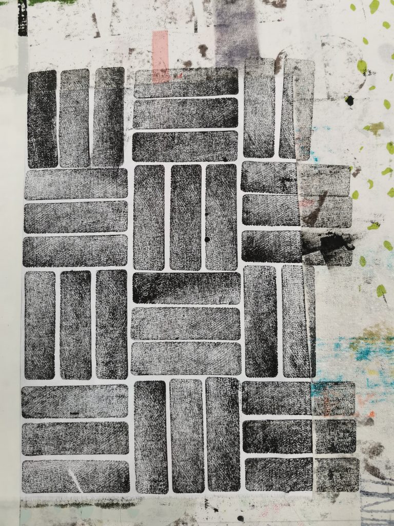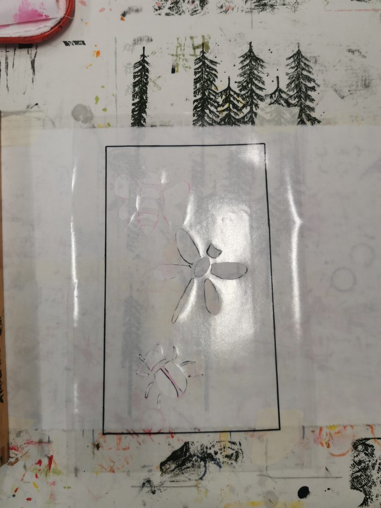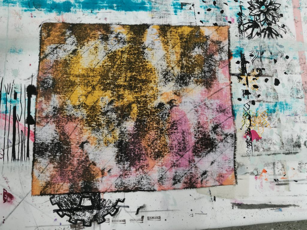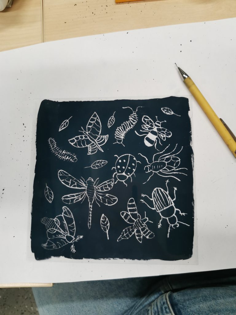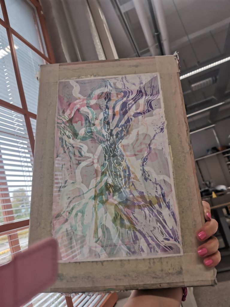 Kurssilla kokeilimme myös erilaisia maalausmenetelmiä ja värin raaputusta, estopainotekniikkaa vehnäjauhoseoksella, leimasinpainantaa, kaaviopainantaa paperikaaviolla, monotypiaa, foliopainantaa sekä kokeiluja peittovalkoisella.