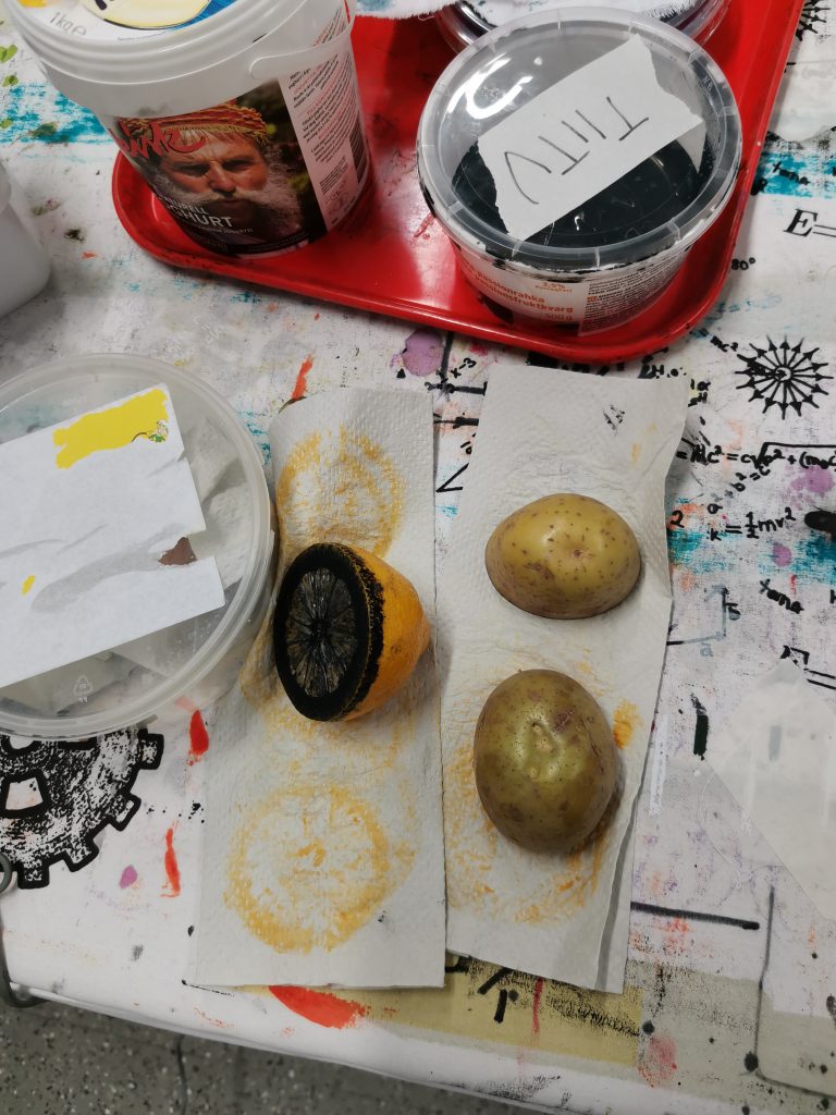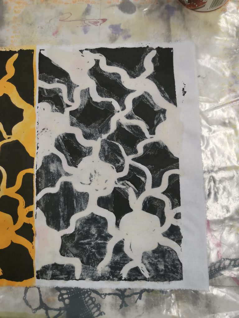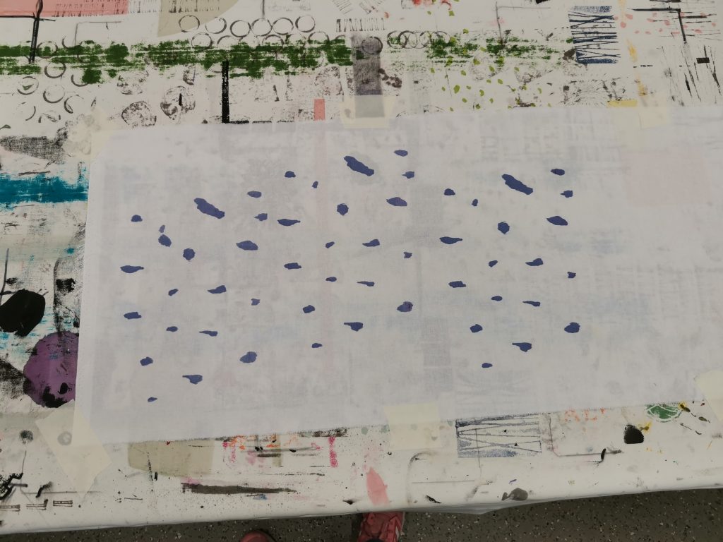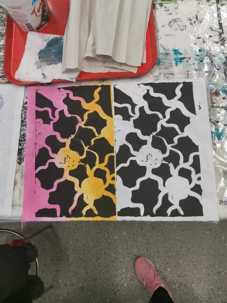 Seuraavaksi kurssilla tutustuimme kankaanpainannan työtiloihin, teoriaan ja välineisiin. Tämän jälkeen aloitimme sekoittamaan värejä sekä tekemällä vahakaavion. Vahakaaviolla painettiin ensimmäiset kuviokokeilut.