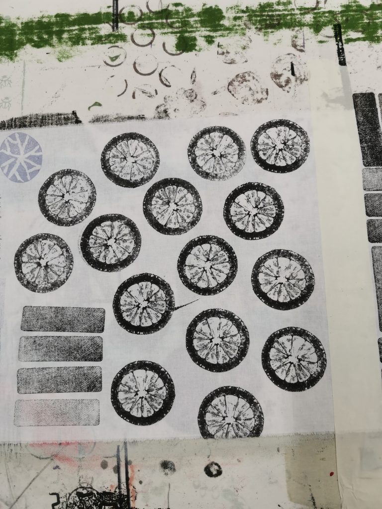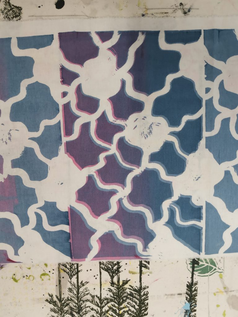 Kurssin loppupuolella halusin käyttää mahdollisimman paljon painoväriä pois, joten hyödynsin valmiita seuloja ”jämä/vanhojen” kankaiden painamiseen.