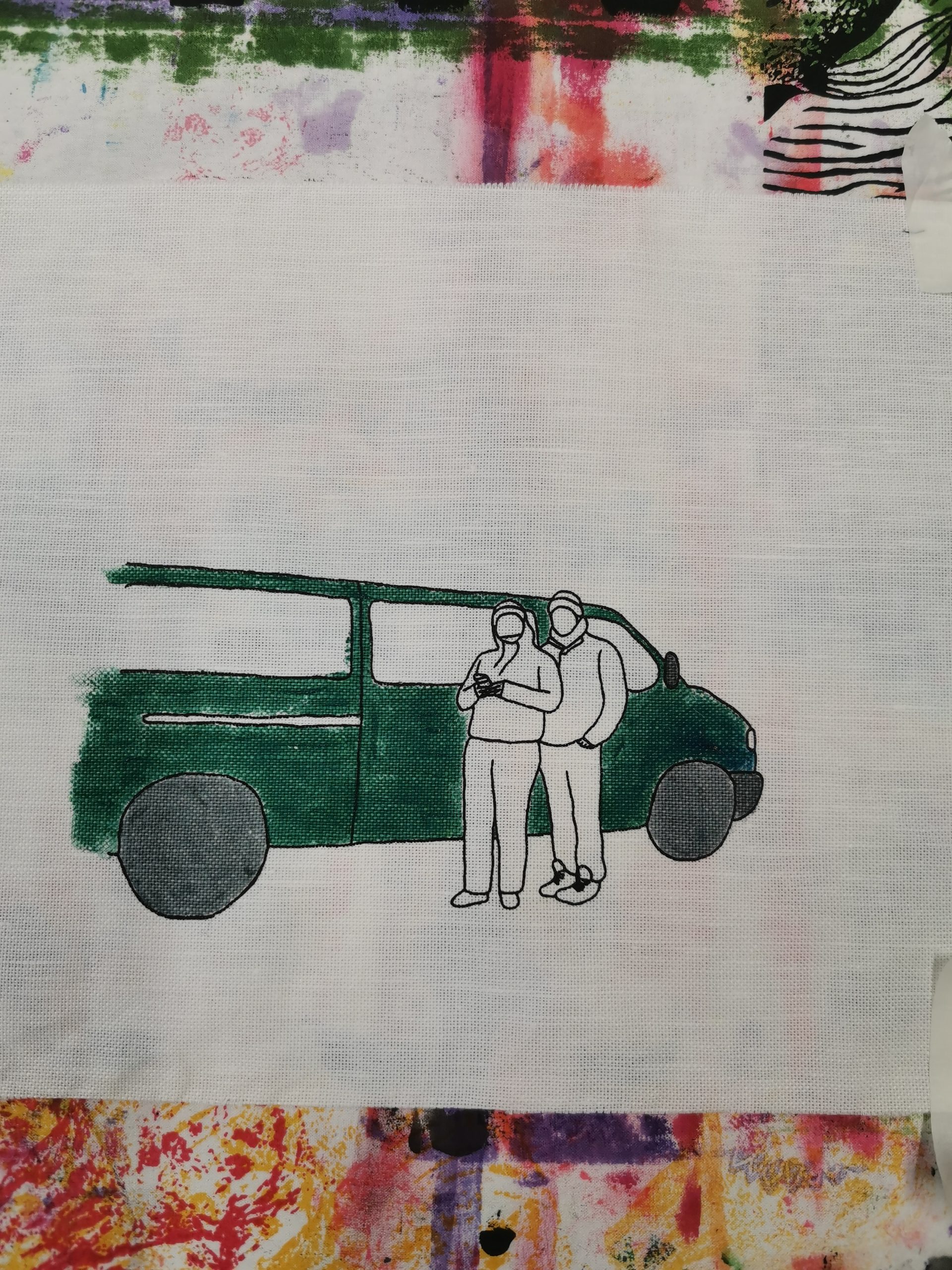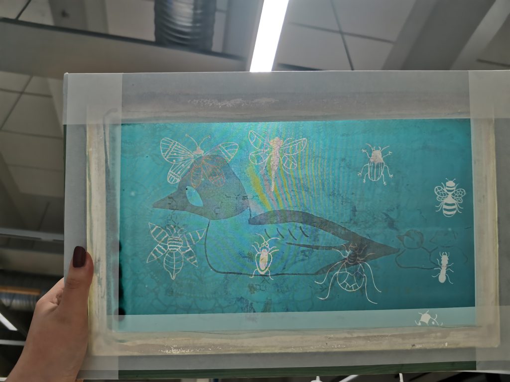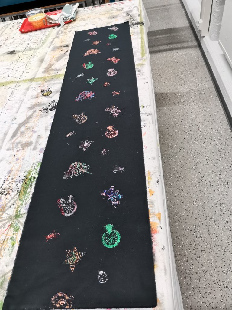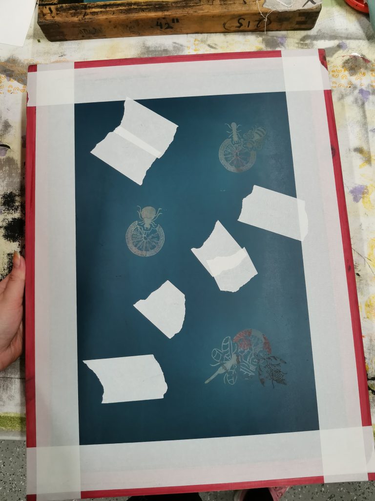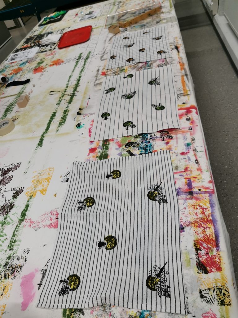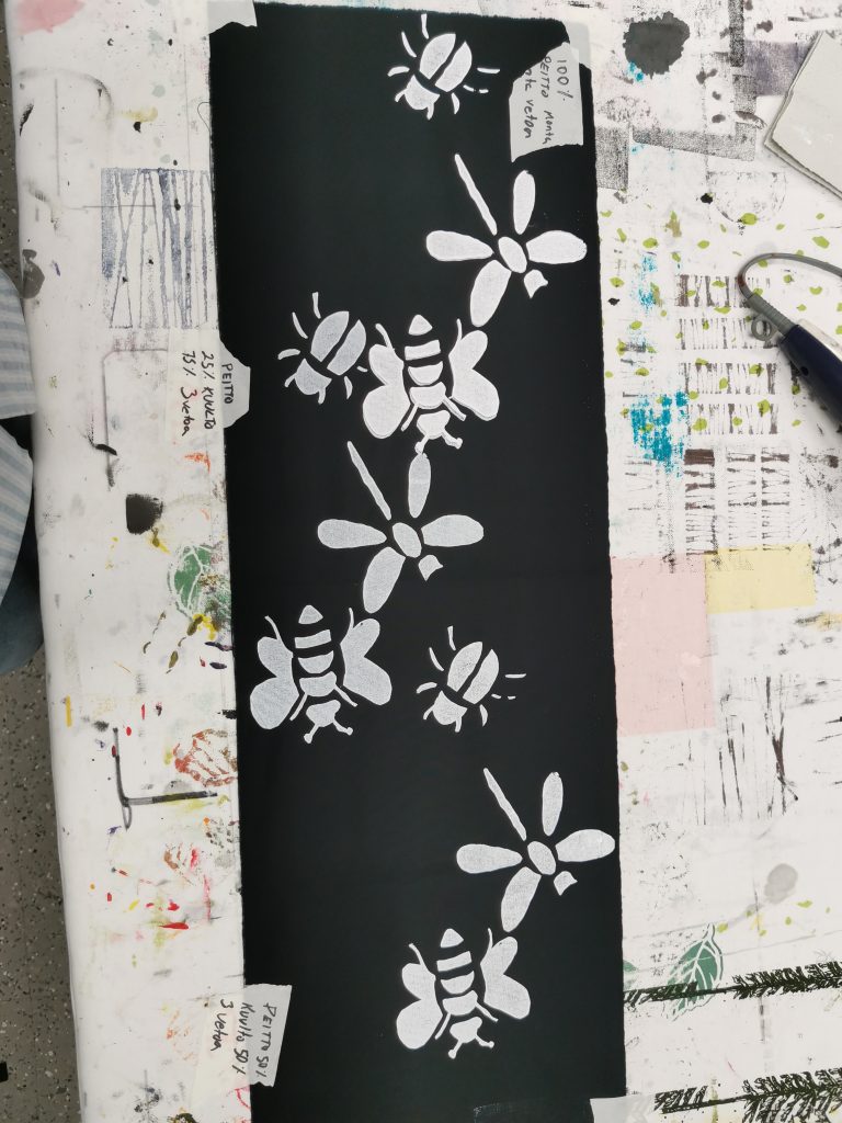Minulla on myös varma olo siitä, että osaan käyttää kankaanpainannan työtiloja -välineitä. Tekniikat sekä väri ja kangas valinnat ovat myös hallussa. Opeteltavaa olisi esimerkiksi kärsivällisyydessä ja hosumisessa. En esimerkiksi malttanut kuivattaa aina kangasta tarpeeksi kauan ennen kuin painoin uutta kuvaa viereen tai värivarojen teippaukset unohtuivat muutaman kerran.