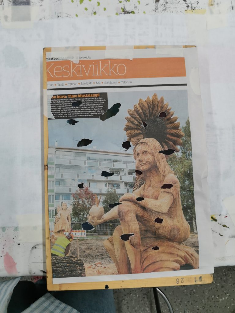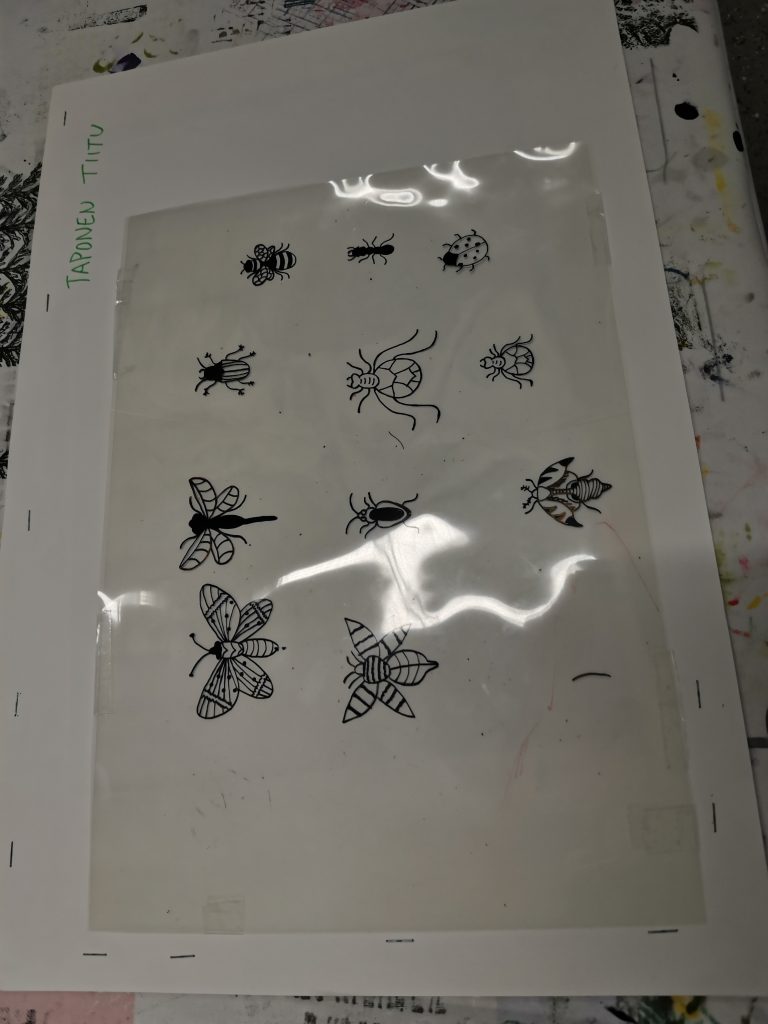 Paperikaavioon käytin vanhaa sanomalehteä johon vain revin pieniä reikiä.Paperikaavio painannan tulos.Peittovalkoisen koostumuksen eri kokeilukertoja. Kokeilin 100% peittovalkoisella, 25% kuultoemulsiota ja 75% peittovalkoista sekä puolet ja puolet koostumuksilla.Kankaan maalaamista.Monotypia-tekniikkaKankaan maalaamista. Tähän päälle levitin mustan painovärin, jota raaputin haarukalla.Raaputustekniikkaa. Kankaanväri ei hirveästi näkynyt alta. Ehkä ekaa värikerrosta olisi pitänyt kuivattaa kauemmin.Raaputustekniikka kokeilutilkun ”nurjasta” puolesta tuli mielestäni hauskan näköinen.Estopainotekniikka vehnäjauhoseoksella. Tässä kuvassa levitetty vehnäjauhoseos kuivumassa.Estopainotekniikan lopputulos.Leimasinpainannan työvälineitä.Leimasinpainantaa käyttäen sitruunaa, sipulia, kaiverrettua perunaa sekä erilaisia puupalikoita.Lisää sitruunanpuolikkaalla tehtyä leimasinpainantaa.Puupalikalla leimasinpainantaa.Tässä mustalle painopohjalle painettuna foliopainannassa käytetty liima. Kuvassa myös sneak peak valotetusta seulasta.Foliopainannan tein jämä foliopaloilla. Tykkään kovasti siitä miten erivärisiä ötököistä tuli. Kangas kiiltää hienosti eri valoissa.Foliopainantaa lähempää.