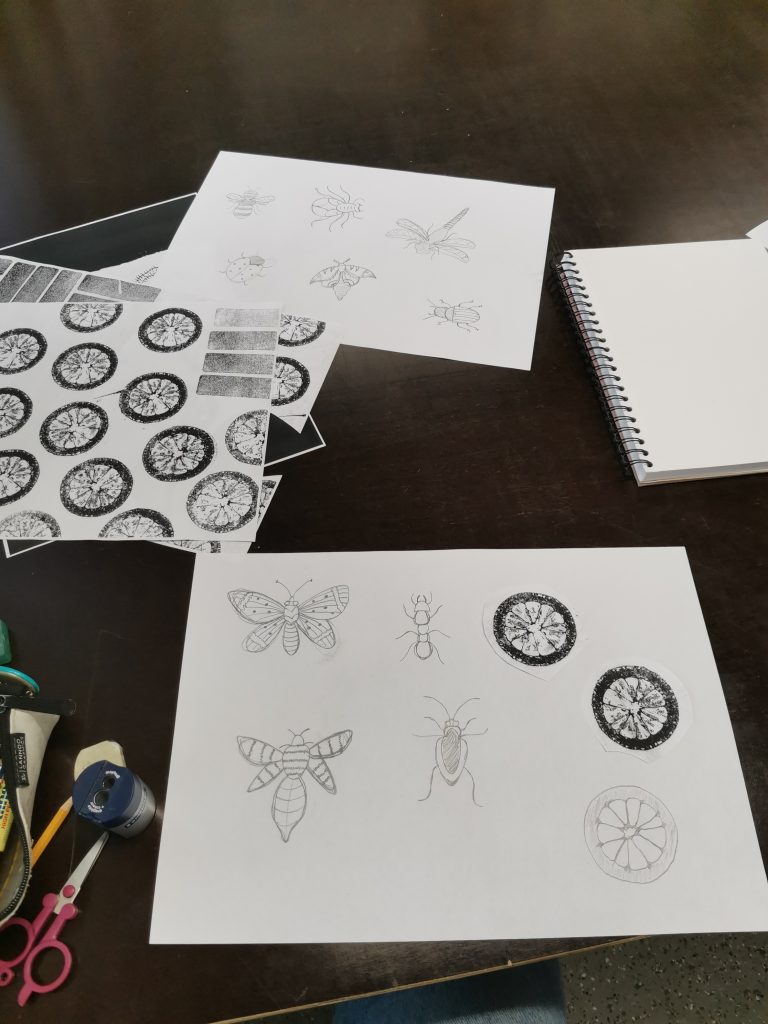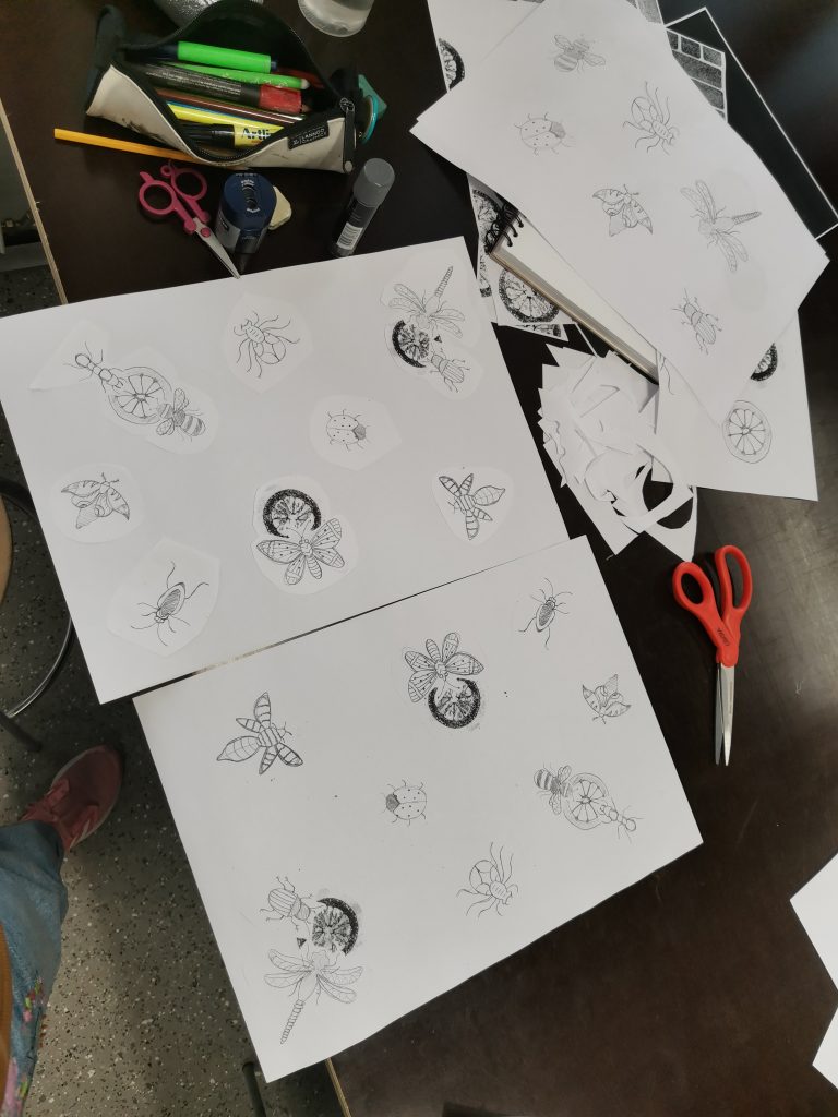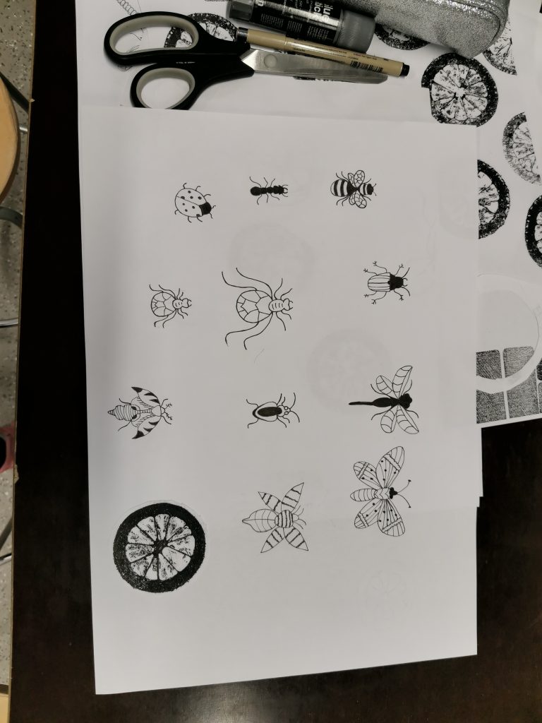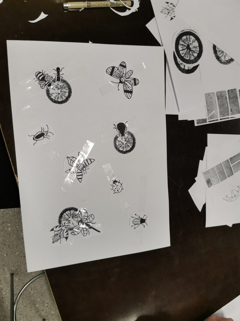 Suunnitteluprosessia.Lisää suunnitteluprosessia.Testiseulaan mennyt kuva valotusfilmillä. Kuva ei mahtunut seulaan kokonaan, mutta se ei haitannut.Valotettu seula valmiina testiin.Max cotton kankaalla kuvio.Painopohjalle eli niin sanotulle lakanakankaalle tehty testi.Seuraavan seulan suunnittelua.Valmis design.Valotettu seula.Ensimmäiset painokokeilut.Jatkuvan kuvion tekemistä.Lähikuvaa painannasta.Painoin ötököitä myös kankaalle, johon oli aikaisemmin painettu paperikaaviolla.Valotetulla seulalla tehtyjen painantojen jälkeen aloin painamaan puolipellavalle. Kyseisestä kankaasta valmistuu opintojen edetessä sohvatyyny.Tyynykankaan jälkeen painoin pitkän pätkän max cotton kangasta, josta valmistuu myöhemmin kangaskasseja.Päätin värittää ötökät kankaan elävöittämiseksi. Sitruunat on väritetty käyttämällä kaaviopainantaa, jossa kaaviomuovi. Punaiset leppäkertut on tehty sabluunalla, jonka läpi on sienellä tuputeltu väriä. Vihreät ja oranssit kohdat on maalattu siveltimellä.