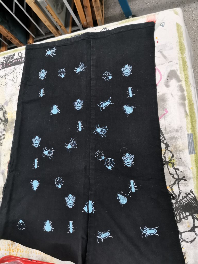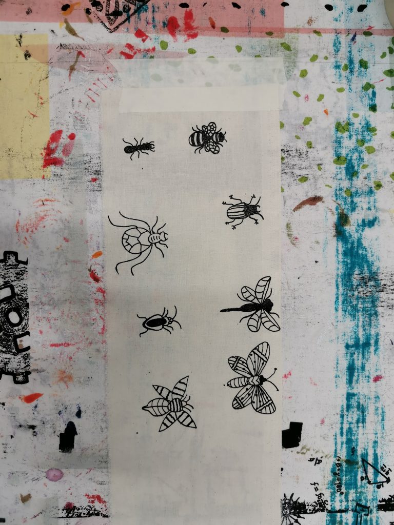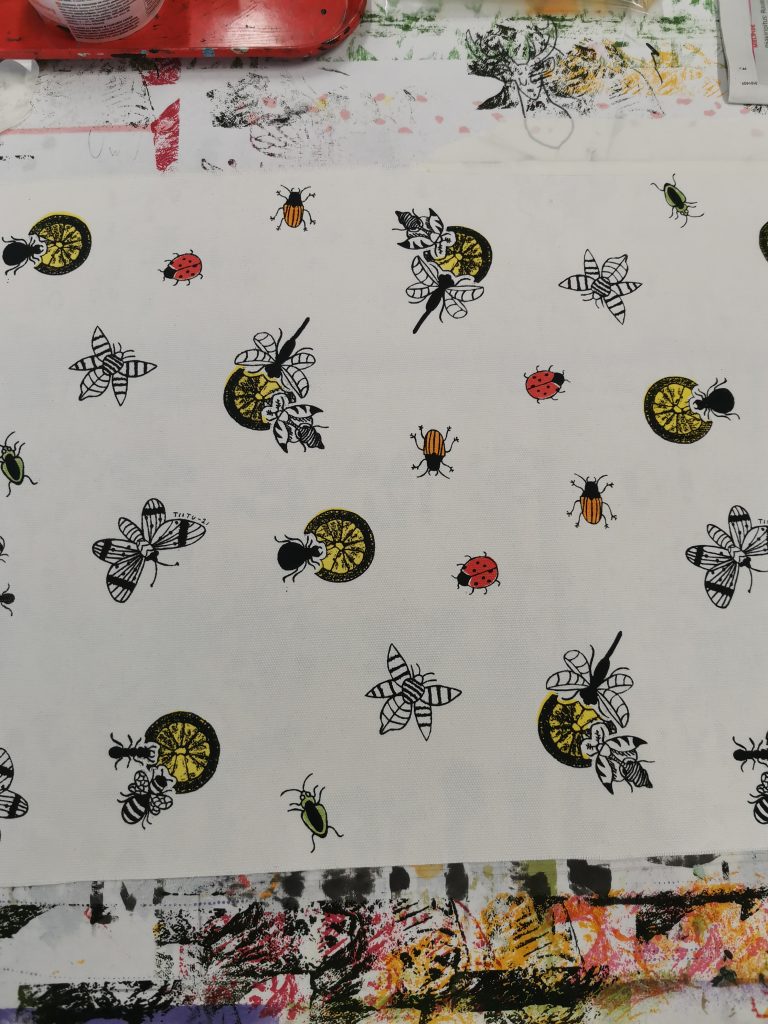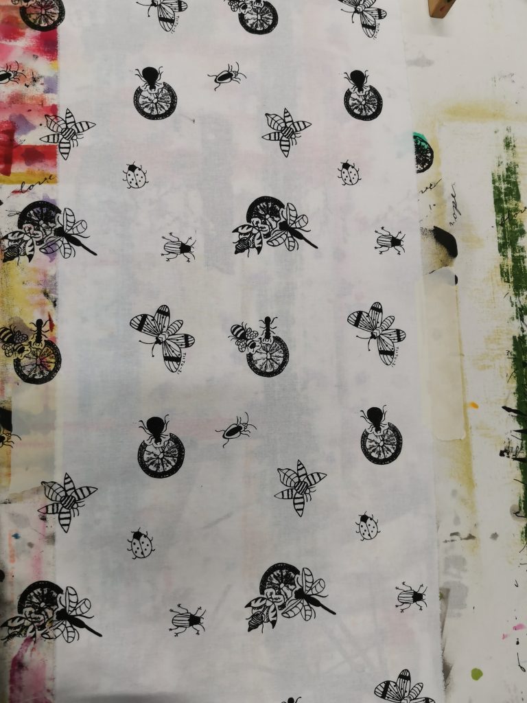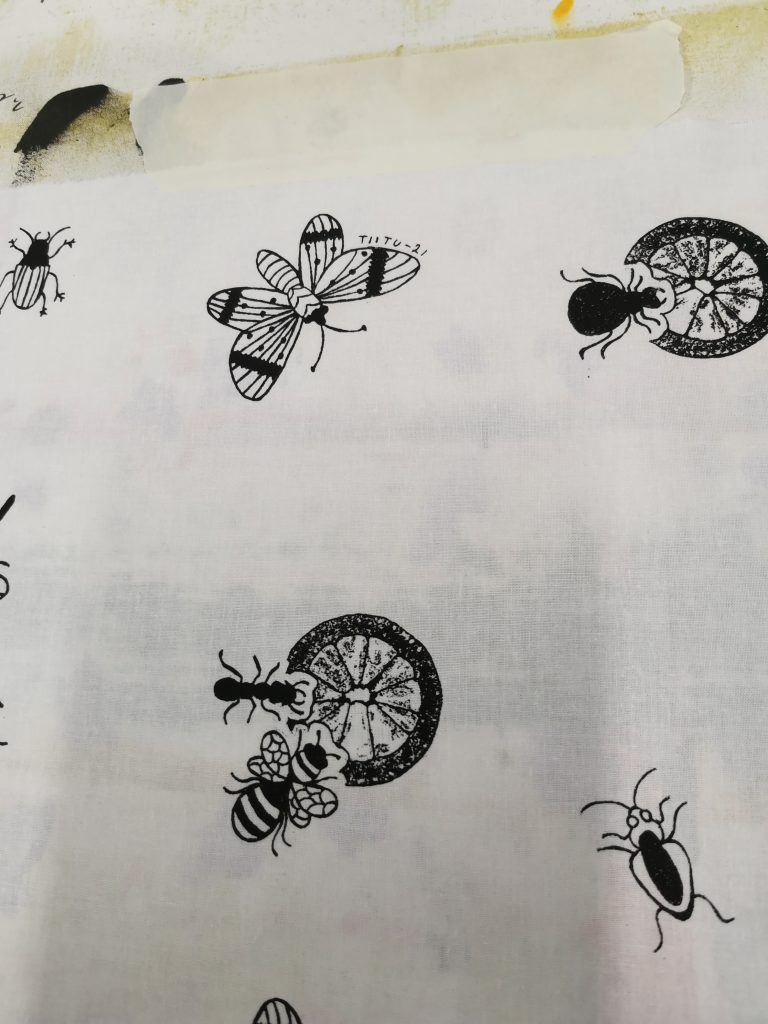 Kurssin yhtenä tehtävänä oli painaa kangasta, josta myöhemmällä ompelukurssilla valmistetaan tyyny. Oma tyynynikankaani on 150cm pitkä ja 34cm leveä. Se on puolipellavaa ja päälle painoin ötökkäkuosia mustalla painovärillä. Tyynyn päätyyn tulee vetoketju kiinnitys.