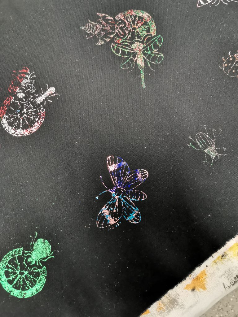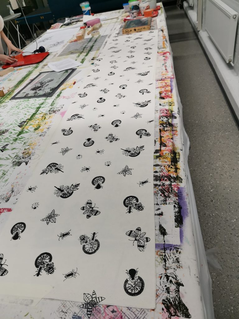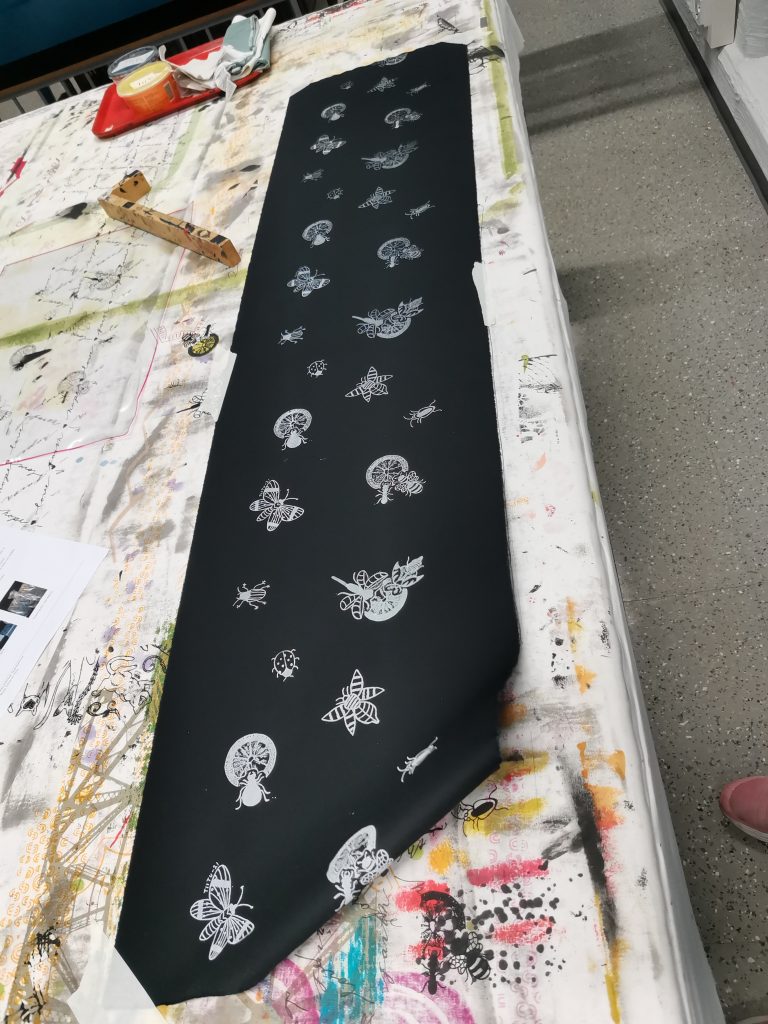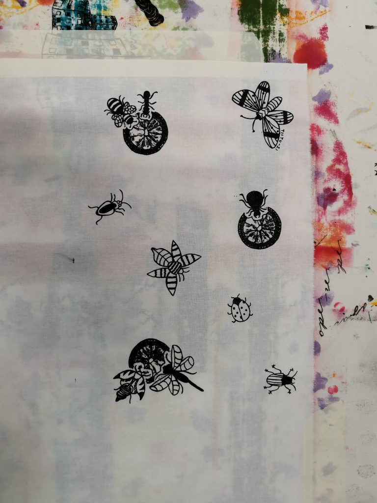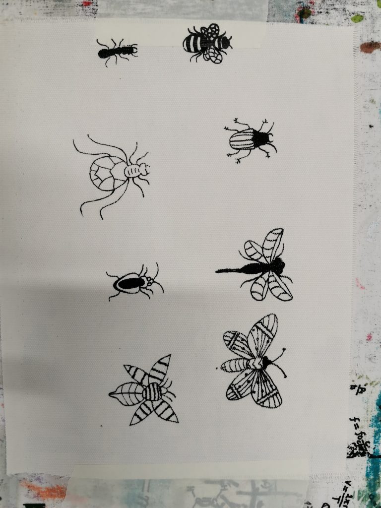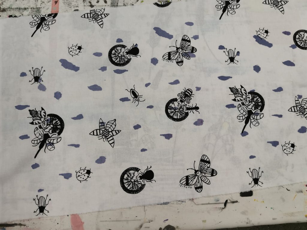 Kurssin yhtenä tehtävänä oli painaa kangasta, josta myöhemmällä ompelukurssilla valmistetaan tyyny. Oma tyynynikankaani on 150cm pitkä ja 34cm leveä. Se on puolipellavaa ja päälle painoin ötökkäkuosia mustalla painovärillä. Tyynyn päätyyn tulee vetoketju kiinnitys.