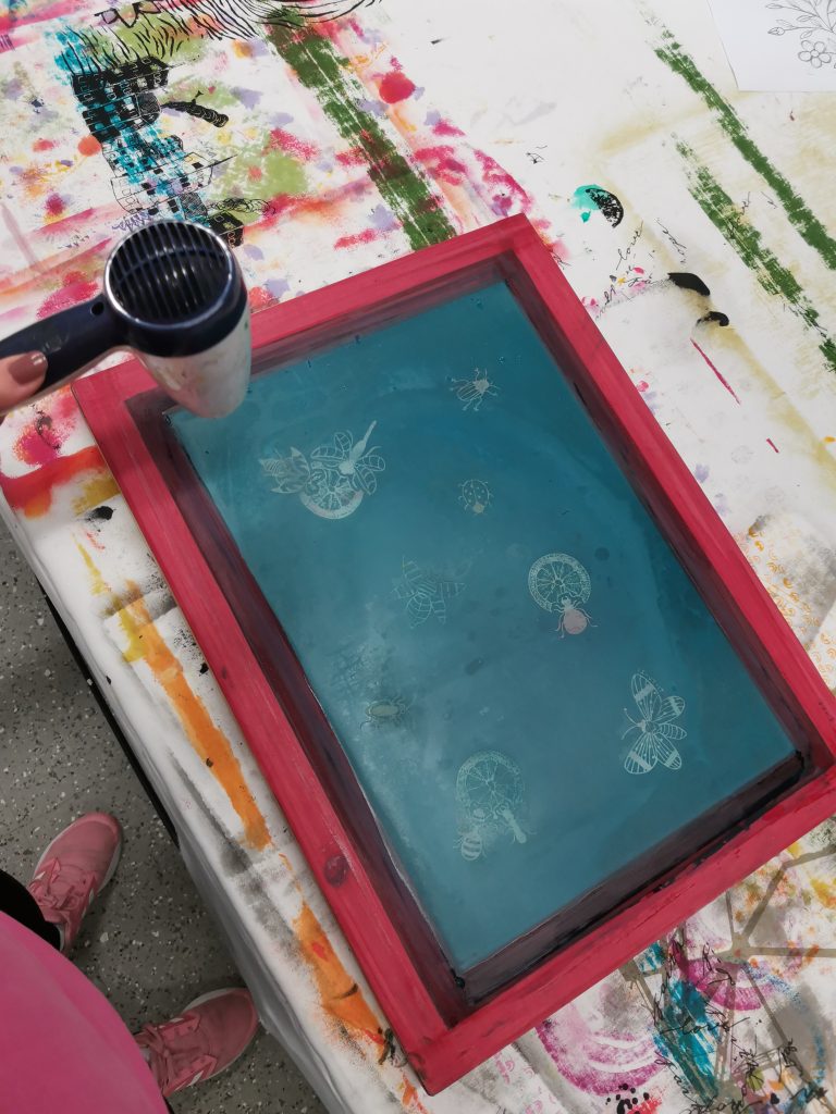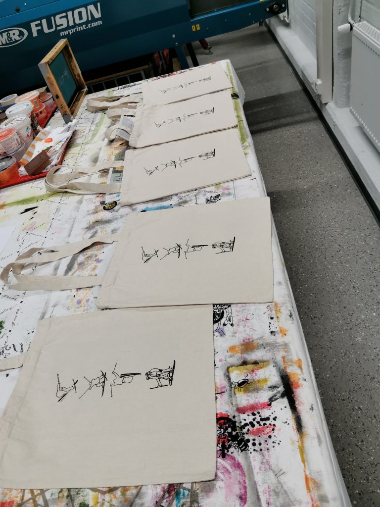 Luomistyötä.Valmis valotettu seula.Ensimmäinen kokeilu jämä max cotton kankaalle.Valmiiden kangaskassien painantaa.Max cotton kankaalle tehdyt painannat.