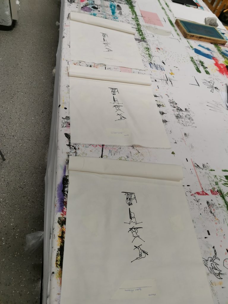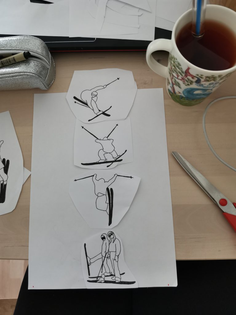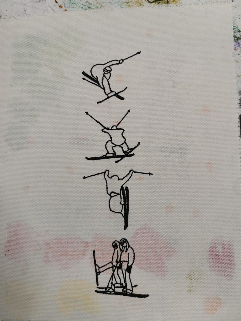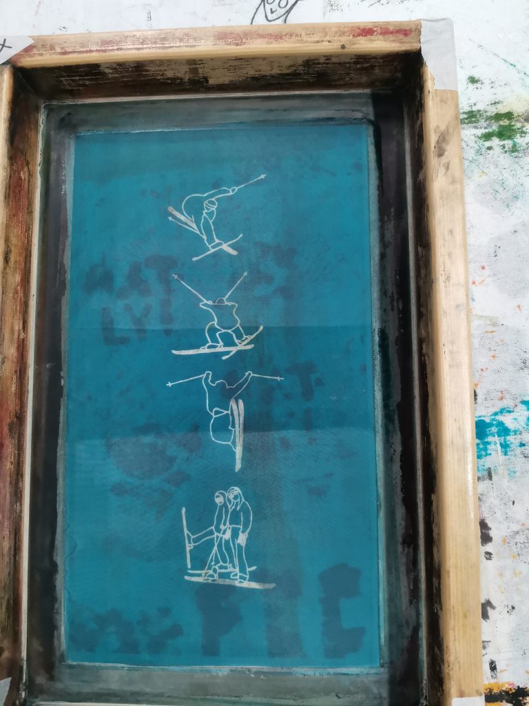 Ötökkä kankaiden jälkeen halusin valottaa vielä yhden pienen seulan. Päädyin piirtämään ystävieni laskettelu kuvista designin puhelimen ohjelmalla. Tulostin kuvat ja sommittelin paperille. Painoin tällä seulalla valmiita kangaskasseja sekä max cotton kangasta, josta myöhemmin valmistuu sitten itse ommeltuja kasseja.