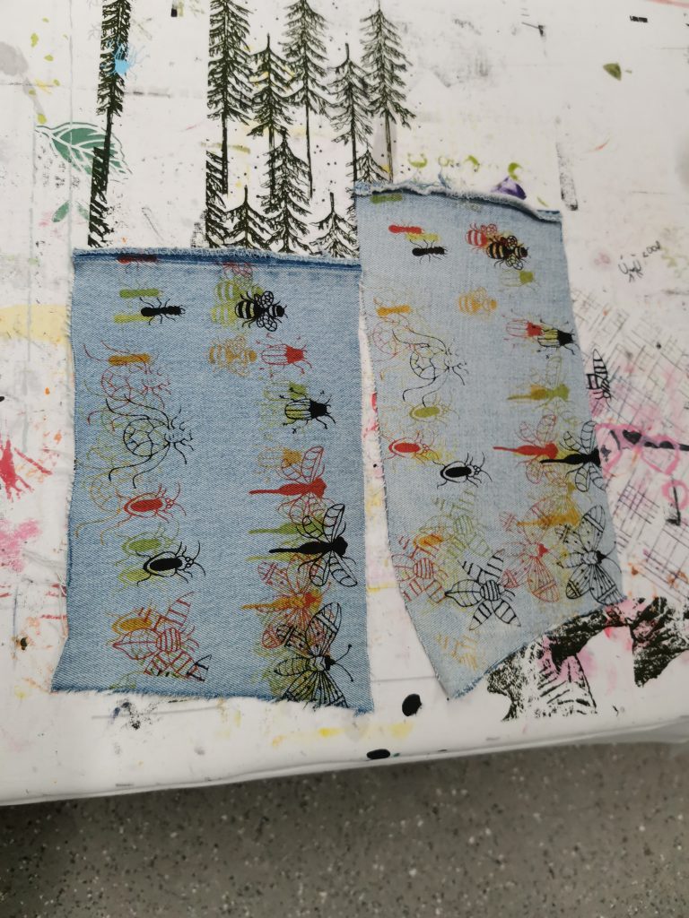 Muokkasin ötökkä seulaa teippaamalla pikku ötökät piiloon, jottei väri tule niistä läpi.Ötökkä seulalla painoin vanhoja keittiöliinoja, joiden sitruunat väritin keltaiseksi, vihreäksi ja oranssiksi.Teippasin myös harjoittelu seulasta suurimmat ötökät piiloon ja painoin jämä väreillä vanhojen farkkujen lahkeisiin. Tästä tulee opintojen edetessä meikkipussi.Farkkushortsien lahkeisiin painoin loput värini harjoitteluseulalla. Tästä tulee luultavasti myöhemmin penaali.