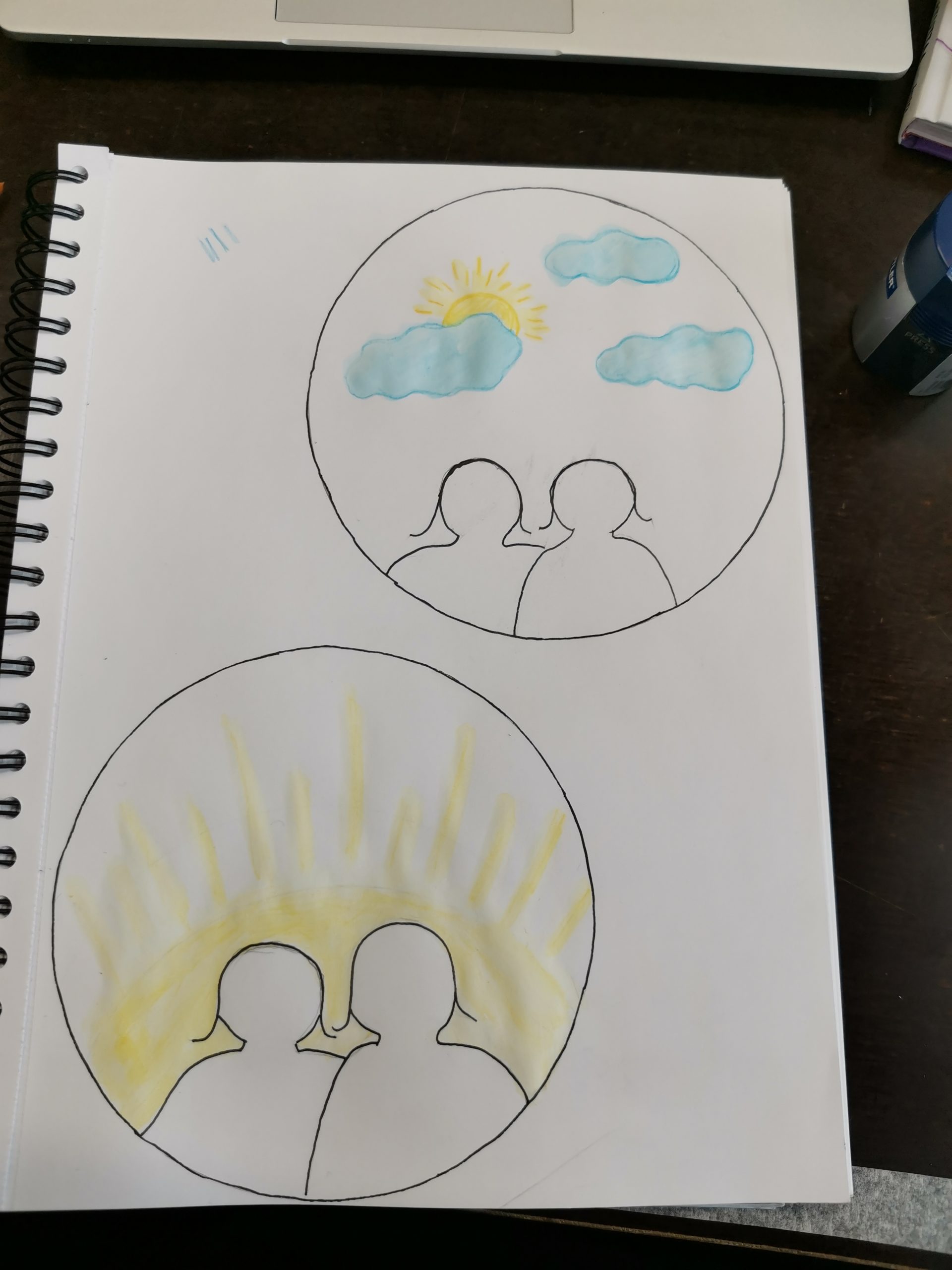 Koko prosessi alkoi oikeastaan kuvien piirtämisellä puhelimella sekä käsin tehdyillä luonnoksilla. Tein kuvista useamman version eri paksuisilla viivoilla sekä eri yksityiskohdilla. Piirtämisen jälkeen tein kuvista halutun kokoiset ja valotin niistä seulan. Seulaan valotin kuvat vierekkäin ilman pilviä ja kukkaköynnöksiä.