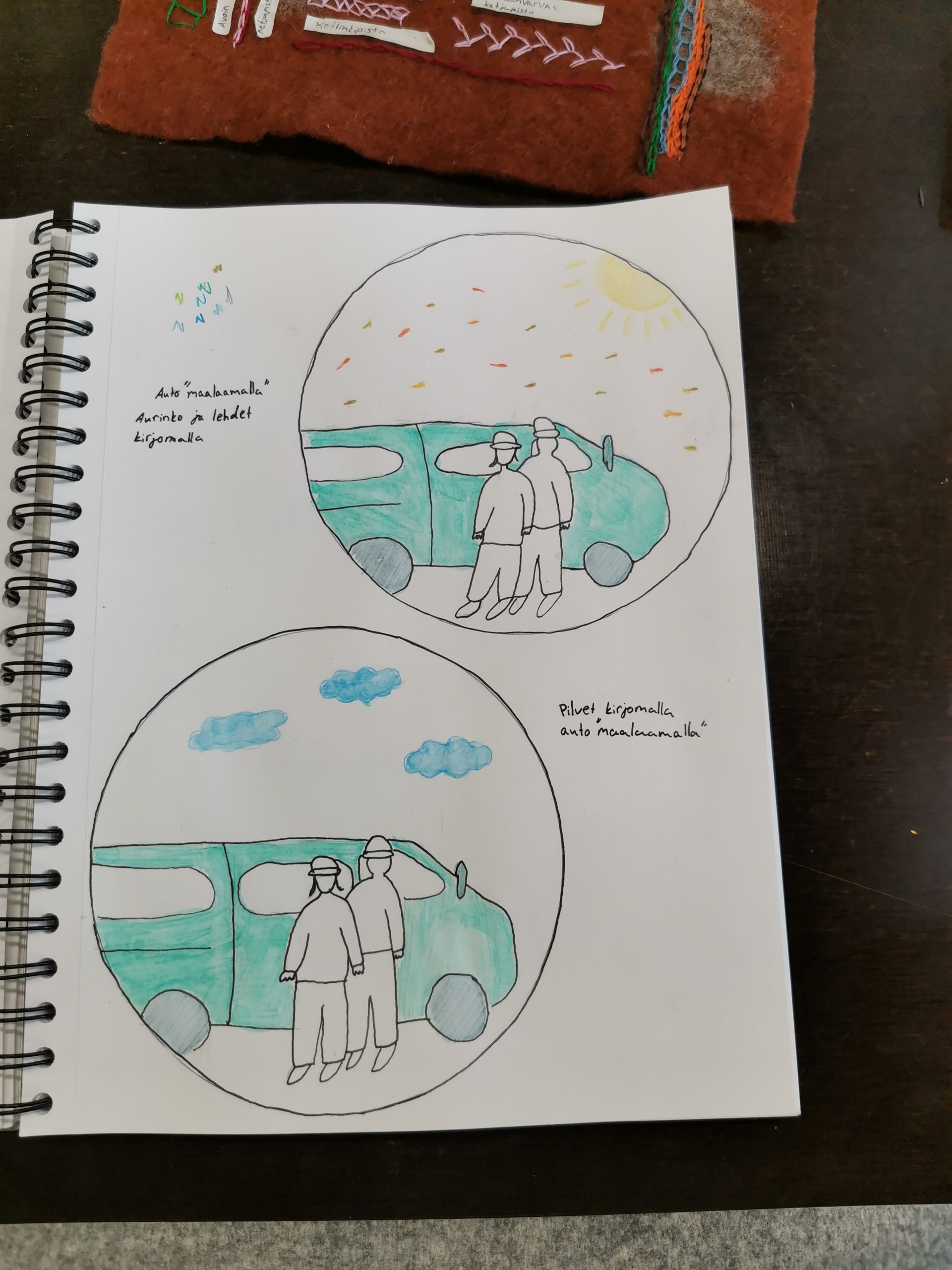 Vahakaaviolla tehdyt kokeilut.Maalausmenetelmien kokeilua. Kuva maalattu sienillä tuputtaen vahakaaviolla tehdyn kuvan päälle.Sienellä maalattu kangas, jonka päälle maalasin mustalla ja märkää väriä raaputin haarukalla ja veitsellä.Märän pinnan raaputus.Estopainotekniikalla tehty kokeilu.Leimasinpainanta kokeilut sipulin ja sitruunan puolikkailla, kaiverretulla perunalla sekä erilaisilla puupaloilla.Leimasinpainannan rytmitystä.Paperikaavio kokeilu sanomalehdellä. Tähän päälle olen myöhemmin painanut ötököitä.Kaaviomuovi kokeilu.Monotypia kokeilu.Peittovalkoinen kokeilu. Ylimpänä 100% peittovalkoisella. Keskellä 75% peittovalkoista ja 24% kuultoemulsiota. Alimpana puolet ja puolet suhteella.