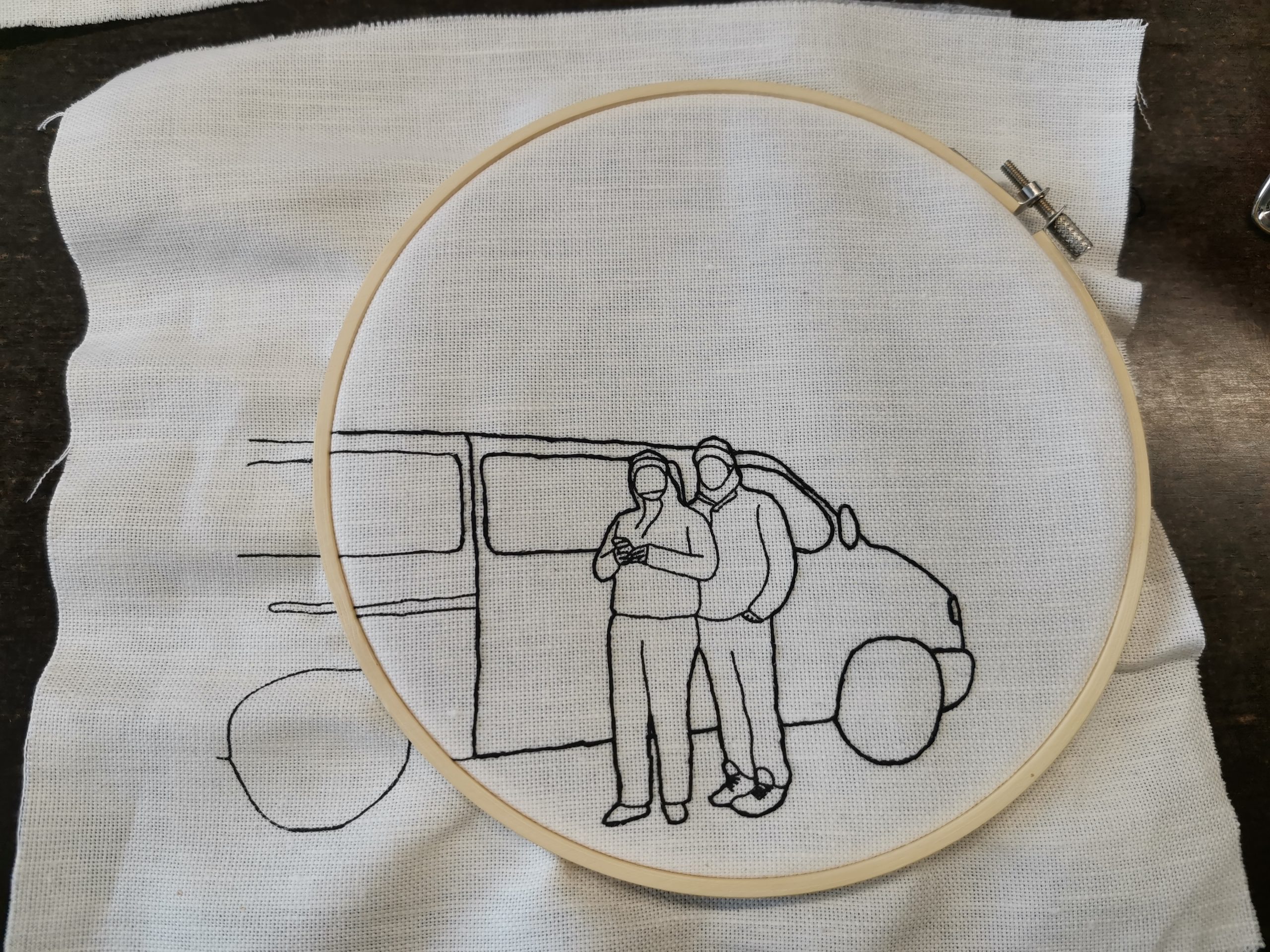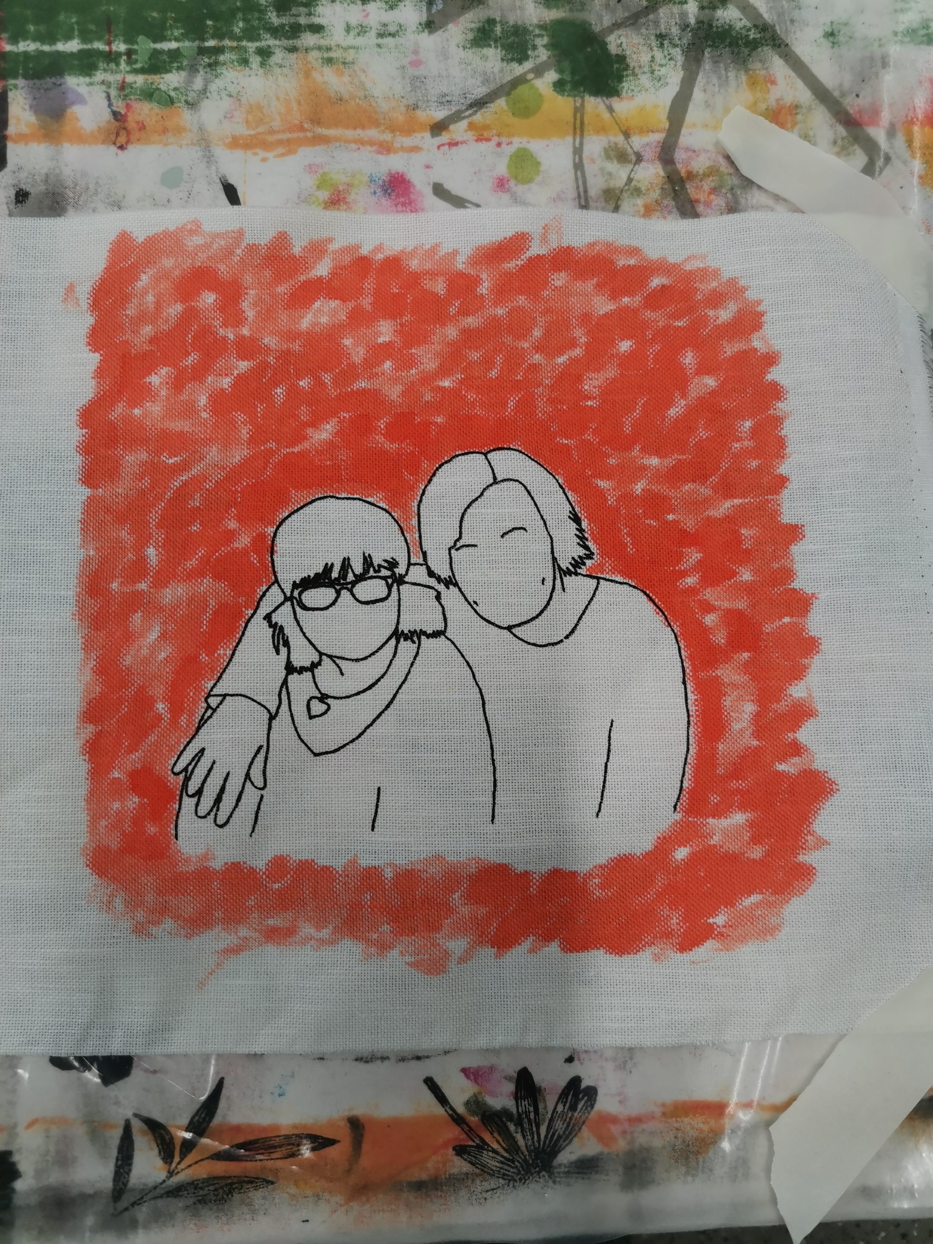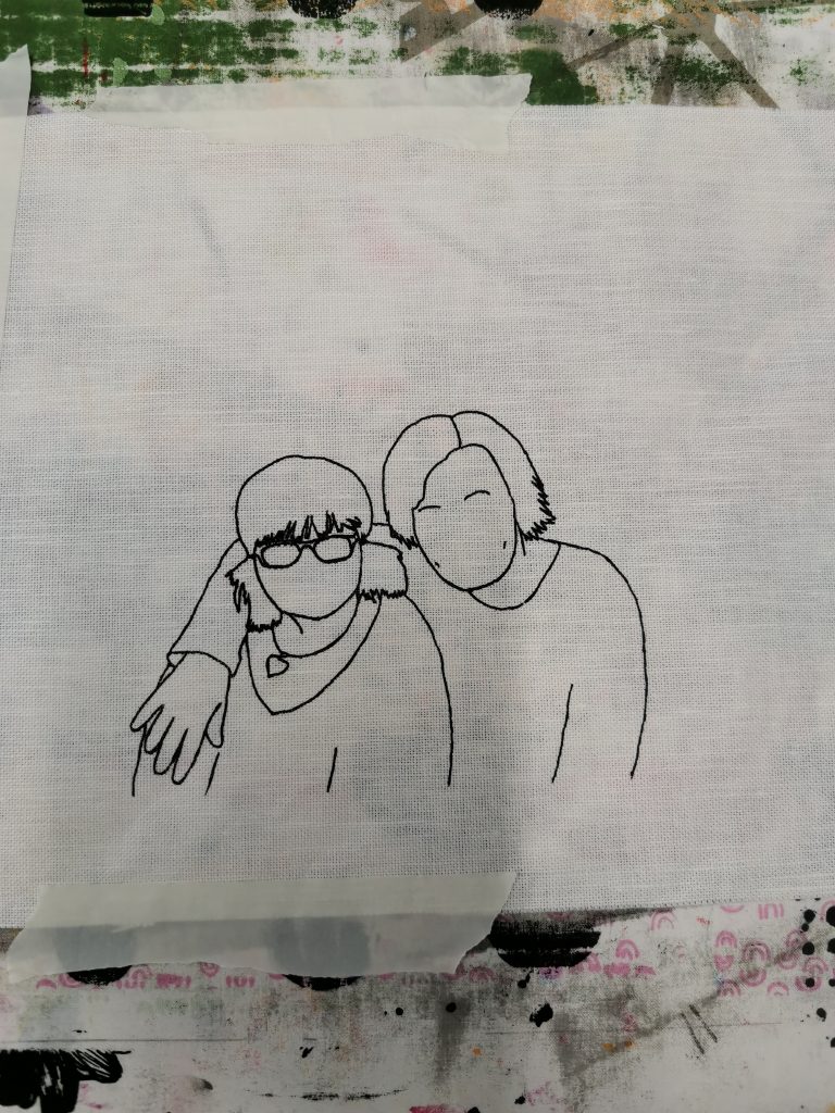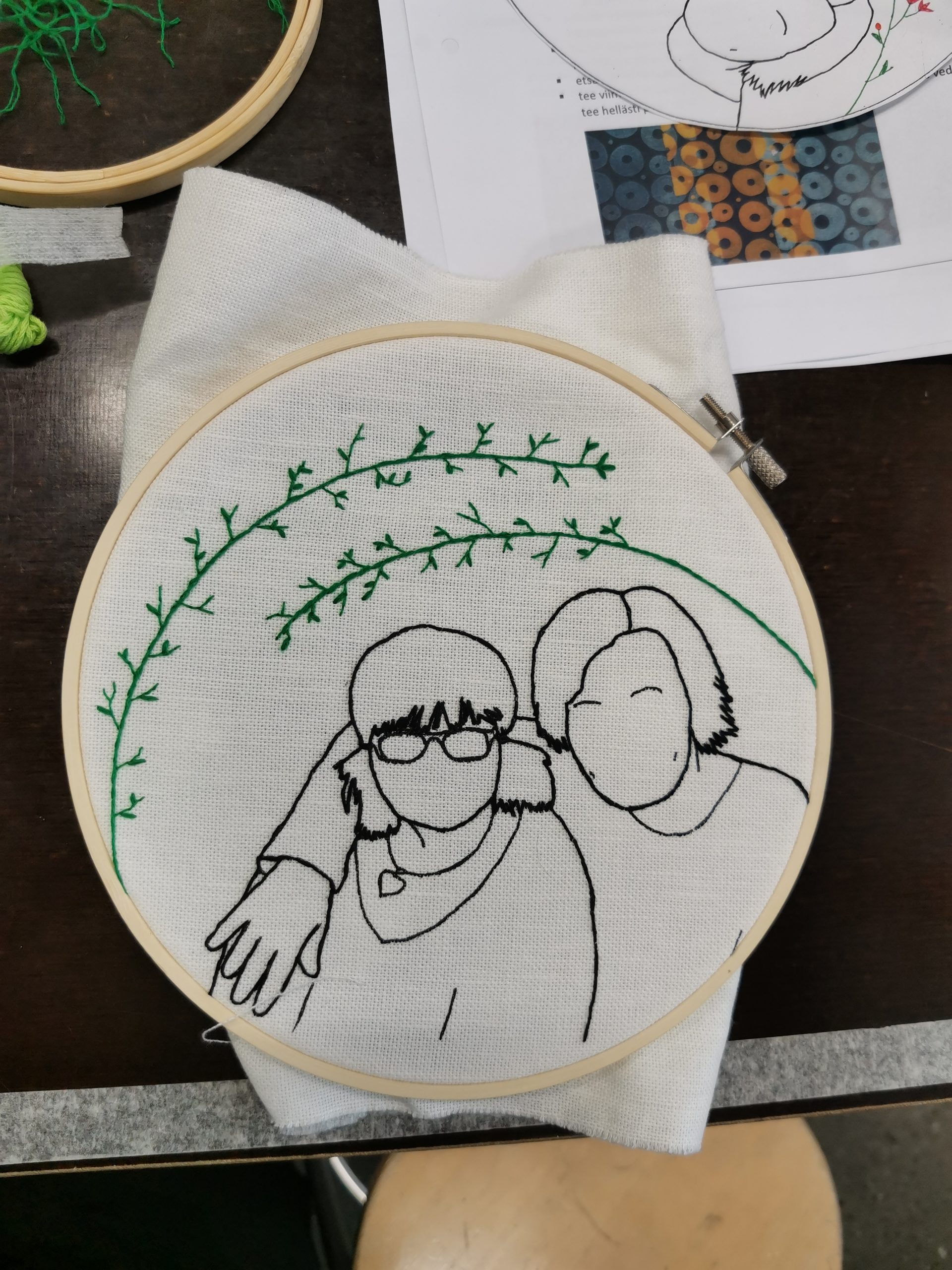 Kankaanpainannan jälkeen harjoittelin kirjontaa hieman ruiskuemulsio kuvaan, jotta näkisin oikeasti kuinka paljon langan paksuus ja kuvan täyttö vaikuttavat ilmeeseen. Tämän jälkeen lähdin kirjomaan ensimmäistä taulua niin, että tein aluksi ääriviivat ja sen jälkeen kukkaköynnökset. Köynnökset luonnostelin tauluun lyijykynällä ja kirjoin niiden päälle.