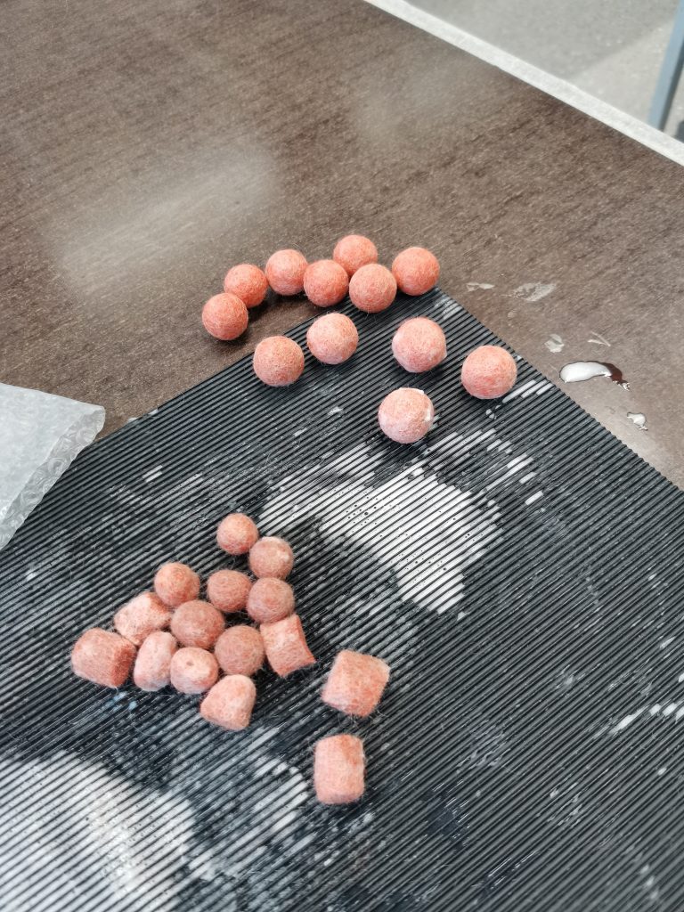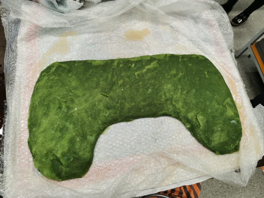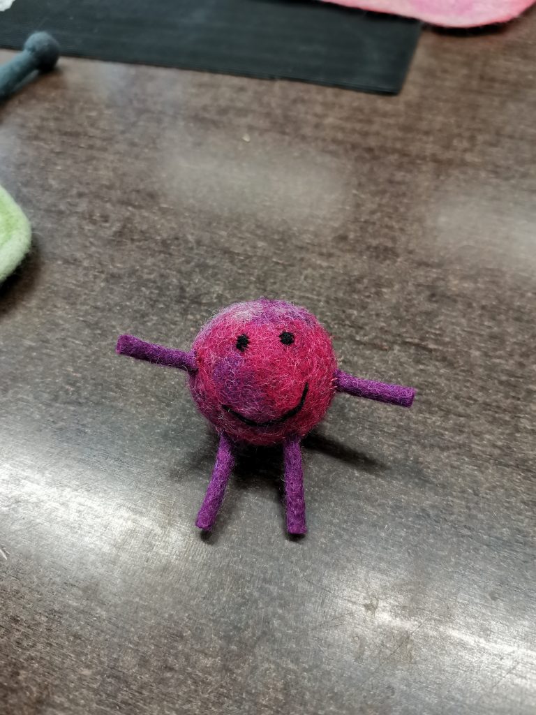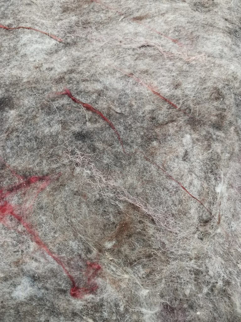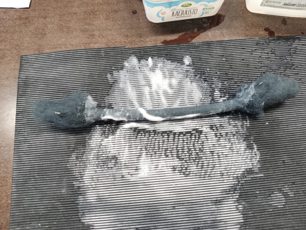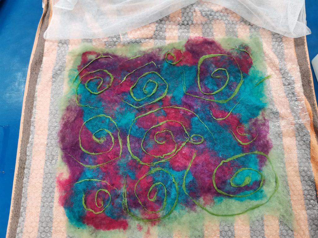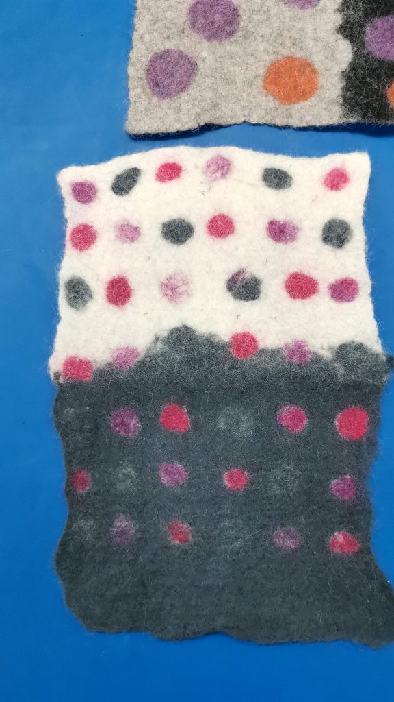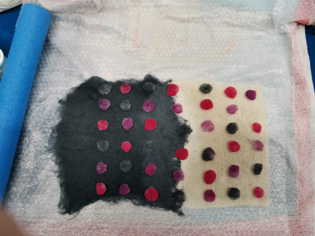 Ensimmäinen kokeilu oli käsinhuovutettu ”päiväkoti-tilkku”.Päiväkoti-tilkku valmiina.Jatkoin päiväkoti tilkun työstämistä myös erilaisilla konekirjonta kokeiluilla. Seuraavaksi tehtiin esihuopa rullaten kuplamuovin avulla.Ei kokonaan tiiviksi huovutettua esihuopaa pystyy käyttämään esimerkiksi kuvioiden tekemisessä. Tästä leikkasin paloja seuraavaan kokeiluun.Tässä kokeilussa testattiin pohjavärin vaikutusta kuvioihin. Valkoiseen villaan tehtiin suora reuna taittaen huovutus vaiheessa ja mustaan piti tehdä suora reuna leikaten huovutuksen jälkeen.Leikkasin esihuovasta pallo kuvioita. Kuvassa näkyy myös valkoisen huovan taitettu reuna.Valmis pohjavärin vaikutus kuvioon- kokeilu. Mustan reunan unohdin leikata.Tässä kokeilussa yhdistin akvarellimaisuus/värien siftaus ja märällä kuidulla kuviointi kokeilut.Märkää huopaa venytettynä kuvioiksi tiivistetyn pohjan päälle.Valmis kokeilu.Seuraavaksi kokeilin kotelointia. FeltFactionin jääkarhu -esihuovan päälle neulattiin kevyesti muutama kerros villaa, joka sitten märkähuovutettiin valmiiksi. Esihuopaa on helppo leikata haluamaansa muotoon.Samaan kokeiluun yhdistin myös nyöri- kokeilun sekä osien liittämisen toisiinsa -kokeilun. Huovutin ötökälle tuntosarvet, jotka liitin esihuopaan ladonta vaiheessa.Ötökkä märkähuovutus vaiheessa.Tuntosarviin huovutin myös pallot päihin, jotka ompelin myöhemmin kiinni. Tässä siis myös pallo -kokeilu.Valmis ötökkä.Pallosta ja pienestä nyörin pätkästä huovutin myös Koronaksi nimetyn ystävän.Seuraavaksi kokeilin erilaisten materiaalien liittämistä huopaan. Huopaan liitin silkkiä erilaisissa muodoissa, hamppua sekä glitteriä. Tässä kokeilussa testasin myös leikatun huovan pintaa/ kerrosten värien siftausta eli villaa on ladottu monta kerrosta eri väreissä. Huovan sisään on myös jätetty muovin palasia, jotka auki leikatessa paljastavat alemmat kerrokset.Valmis kokeilu.