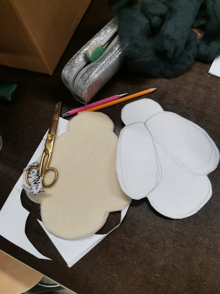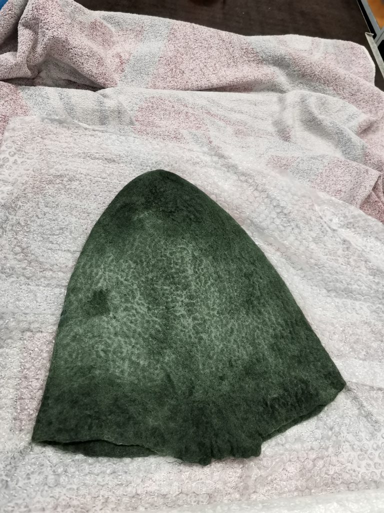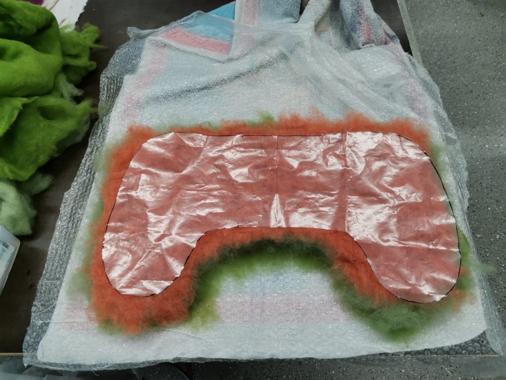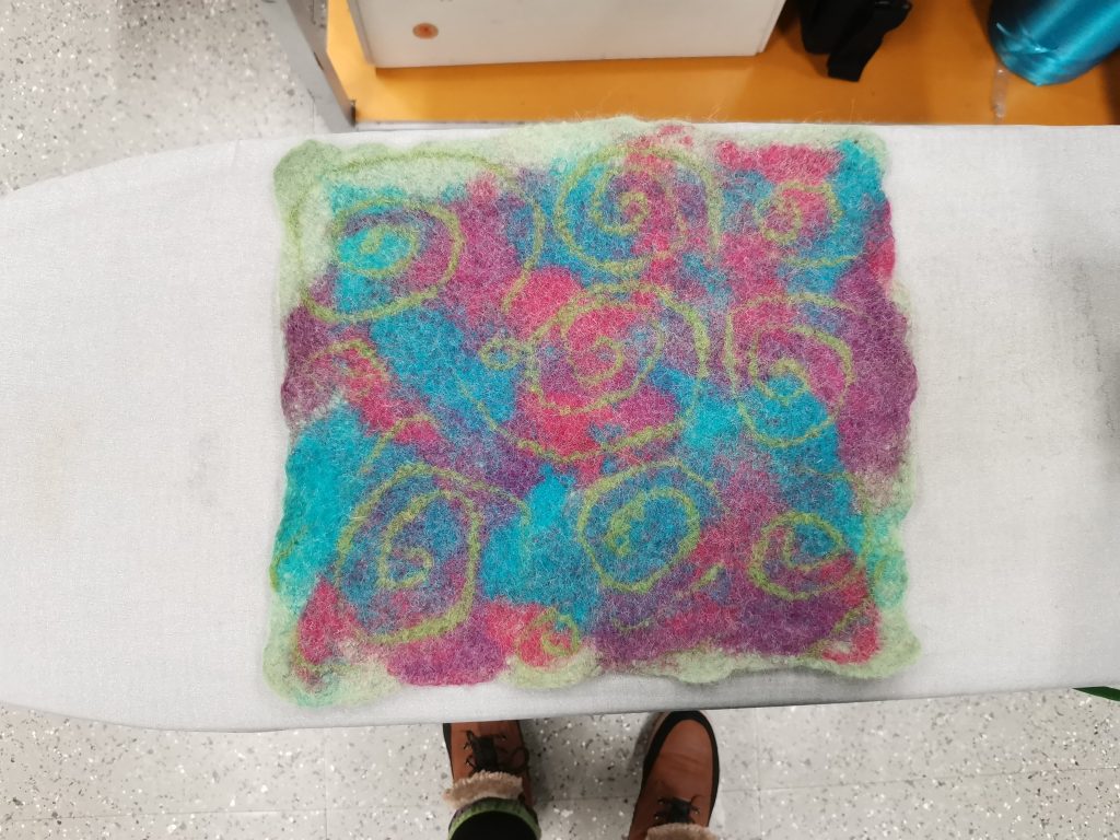 Kaava töissä huomasin tekniikkani paranevan koko ajan. Nuuskamuikkusen hatussa ei enää huomaa kaavan reunoja toisin kuin tumpuissa, jossa unohdin tarkkailla reunojen yhteen huopumista. Kaavatöiden jälkeen valmistin kurssilla vaaditun tuoteperheen tuotteet. Näihin kuului tasona huovutettu huopa, johon suunnittelin kaksi istuinalustaa, sekä kolmiulotteisena kaavatekniikalla valmistettu tuote, johon suunnittelin lattiatyynyn.
