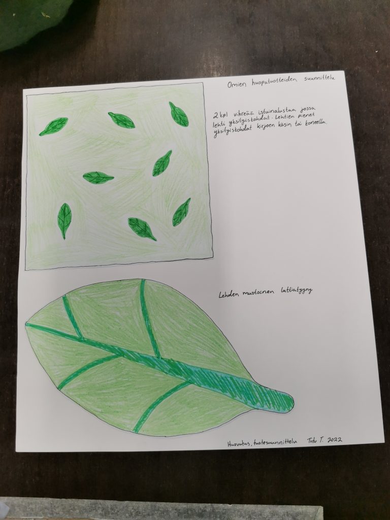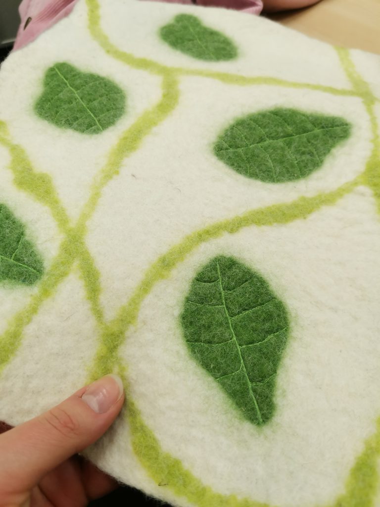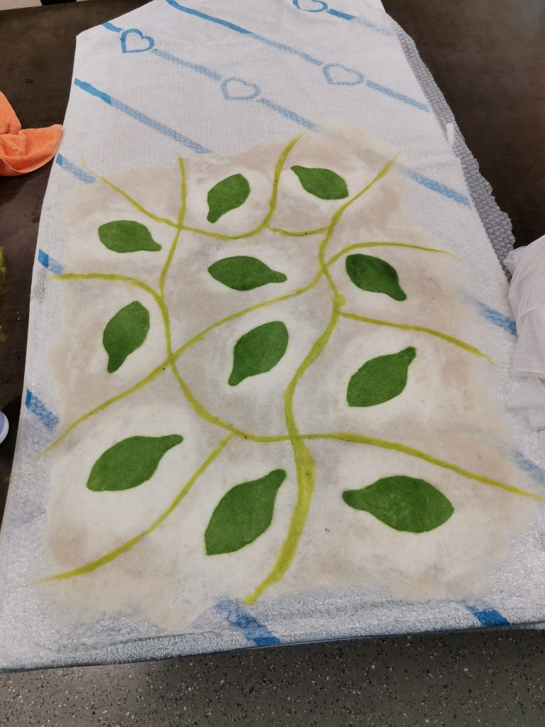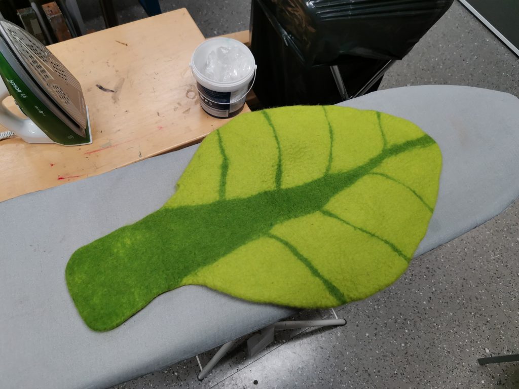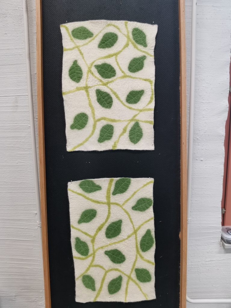 Istuinalusten suunnitelma.Lattiatyynyn suunnitelma.Istuinalusia varten tein esihuovan, josta leikkasin lehden muotoisia paloja.Litistettyyn huopaan ladoin lehdet ja märällä kuidulla muotoilin vaalean vihreät kohdat.Huovutuksen jälkeen vielä konekirjoin lehtiin yksityiskohtia.Valmiit istuinaluset näytillä koulun käytävällä.Lattiatyynyn ladontaa.Litistettyyn huopaan ladoin märällä kuidulla yksityiskohdat.Huovutettu lattiatyyny vailla vanutäytettä ja kiinni ompelua.