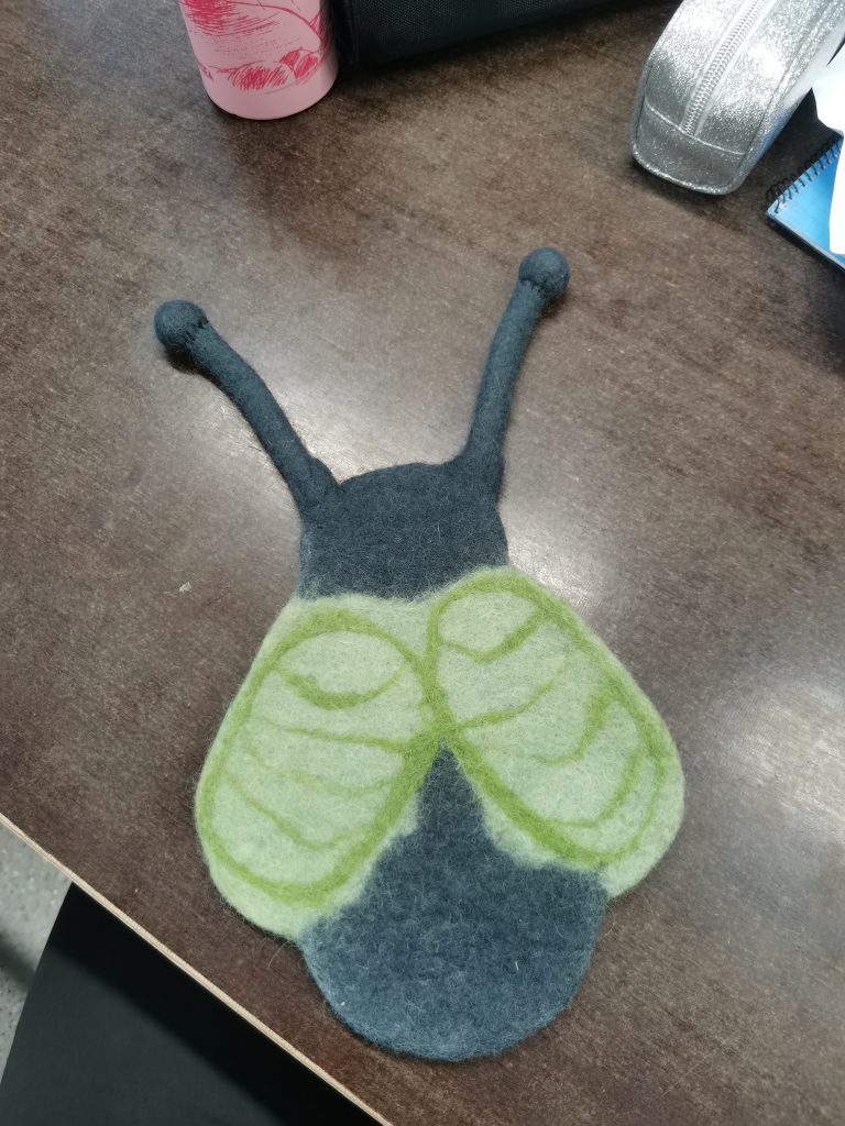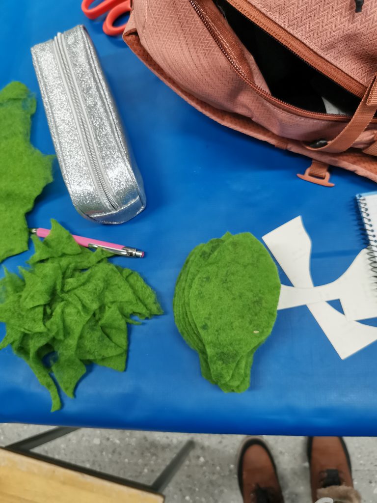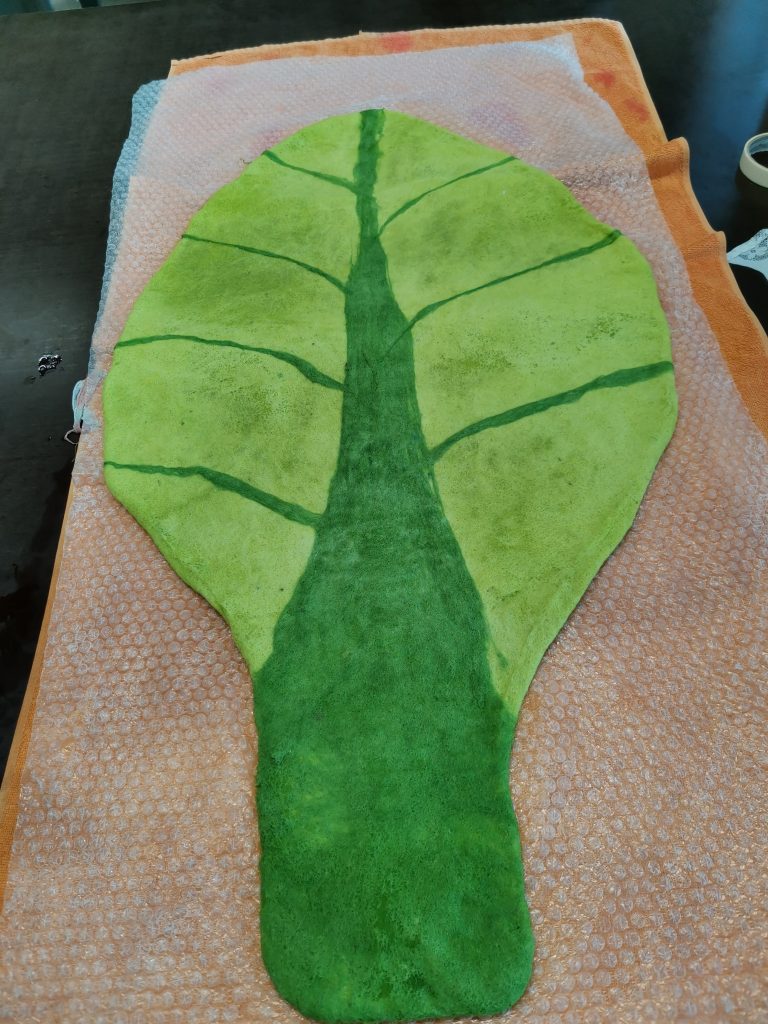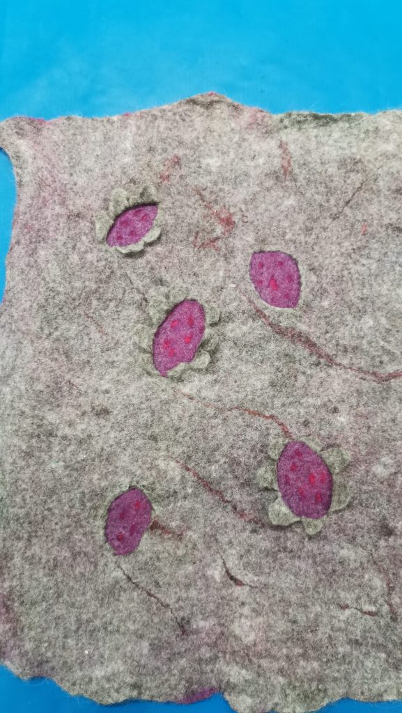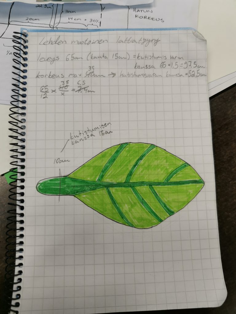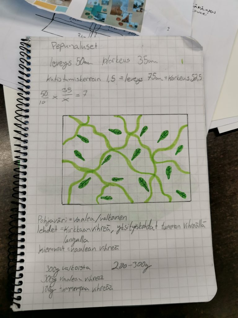 Istuinalusten suunnitelma.Lattiatyynyn suunnitelma.Istuinalusia varten tein esihuovan, josta leikkasin lehden muotoisia paloja.Litistettyyn huopaan ladoin lehdet ja märällä kuidulla muotoilin vaalean vihreät kohdat.Huovutuksen jälkeen vielä konekirjoin lehtiin yksityiskohtia.Valmiit istuinaluset näytillä koulun käytävällä.Lattiatyynyn ladontaa.Litistettyyn huopaan ladoin märällä kuidulla yksityiskohdat.Huovutettu lattiatyyny vailla vanutäytettä ja kiinni ompelua.