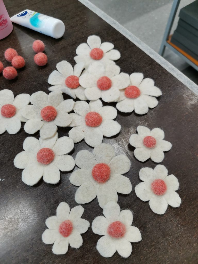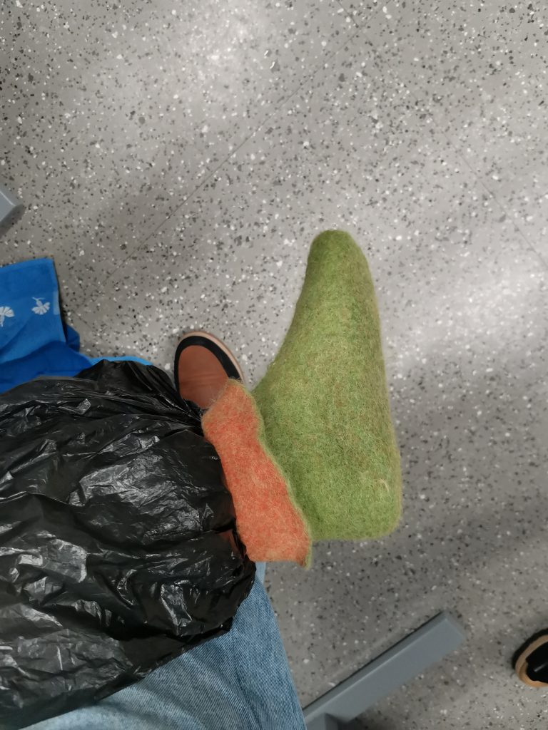 Ensimmäiseksi tein tumput, käytten valmista kaavaa. Tumput ovat päältä violetit ja sisältä punaiset.Valmiit tumput suorina kuivumassa.Tumppujen jälkeen tein huopatossut, joihin käytin myös valmista kaavaa. Kaavaan muokkasin pidemmän varren, jotta saisin sen myöhemmin käännettyä. Tossut ovat sisältä oranssit ja ulkoa vihreät.Tossut rullaus vaiheessa.Melkein valmis tossu.Muotoilu oli hyvä tehdä suoraan omaan jalkaan sopivaksi.Valmis tossu sovitettuna omaan jalkaan.Valmiit tossut.Tossujen jälkeen tein nuuskamuikkusen hatun, johon tein kaavan itse. Tässä hattu rullausvaiheessa.Valmiin hatun sovittelua päähän.Hattuun halusin tehdä mukaan kukkaseppeleen, johon pyörittelin usean pallon.Valkoisesta esihuovasta ja halkaistuista palloista syntyi käsin ompelemalla kukkia.Valmis hattu kukkineen päähän sovitettuna. Tein irtonaisen pannan huovuttamalla, johon liitin kukat, jotta ne voisi tarpeen mukaan myös poistaa hatusta.