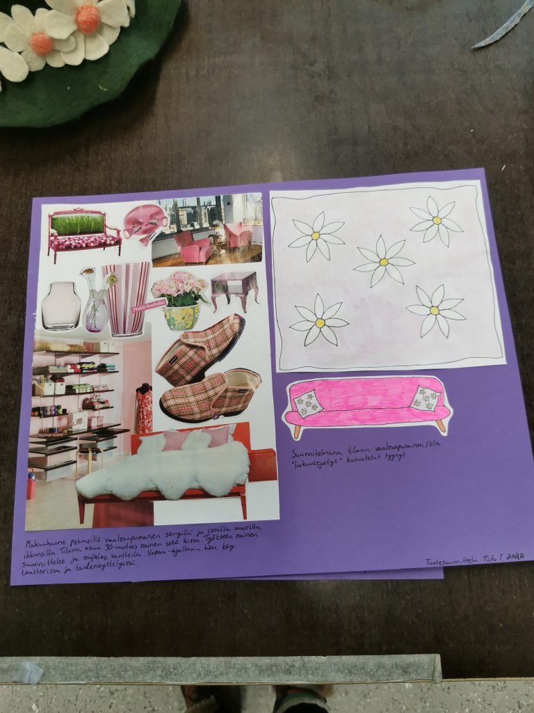 Makuuhuone pehmeillä vaaleanpunaisen sävyillä ja isoilla avarilla ikkunoilla. Tilassa asuu 30-vuotias nainen sekä kissa. Työkseen nainen suunnittelee ja ompelee vaatteita. Vapaa-ajallaan hän käy teatterissa ja taidenäyttelyissä. Tilaan suunnittelin vaaleanpunainen/liila ”liukuvärjätyt” huovutetut tyynyt kukkakuvioilla.Aurinkohuone, jossa paljon viherkasveja ja puisia kalusteita. Tilassa asuu pariskunta, he ovat iältään noin 40-vuotiaita. Molemmat tekevät työkseen sosiaalisen median sisältöä. Heidän harrastuksiin kuuluu puutarhanhoito, jooga ja ruuanlaitto. Suunnitelmana tähän tilaan huovutettu penkin päällinen, jossa vihreän eri sävyjä.