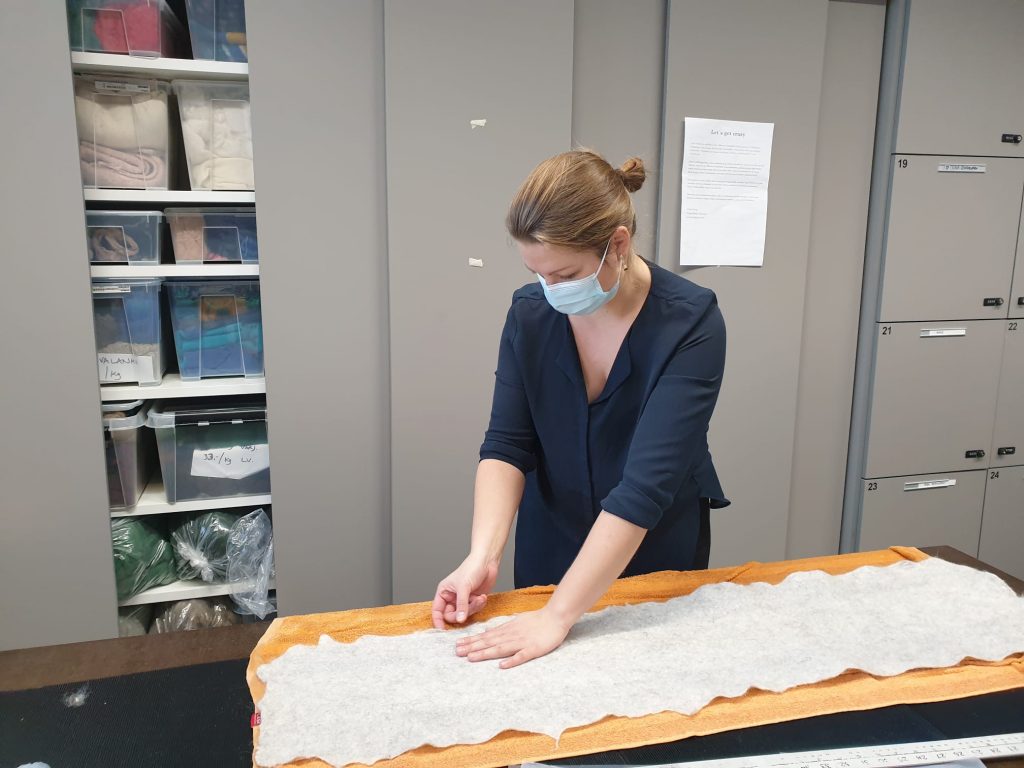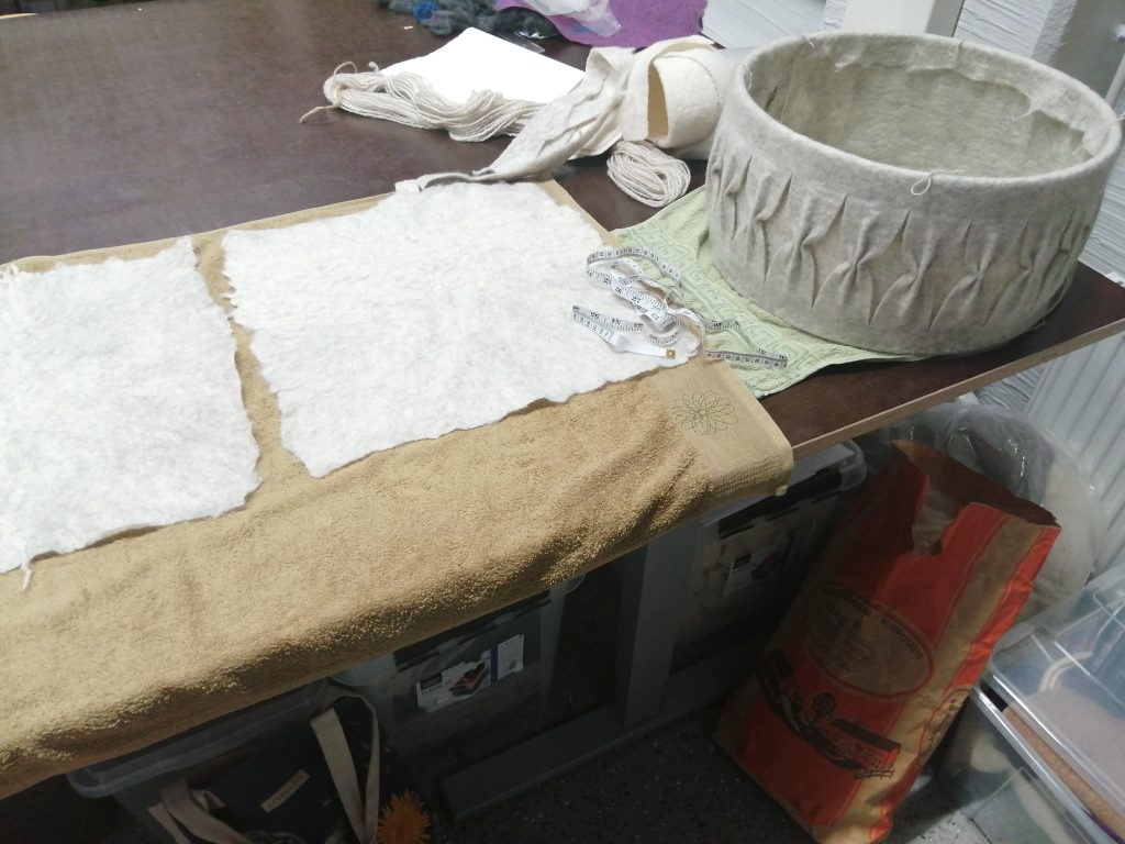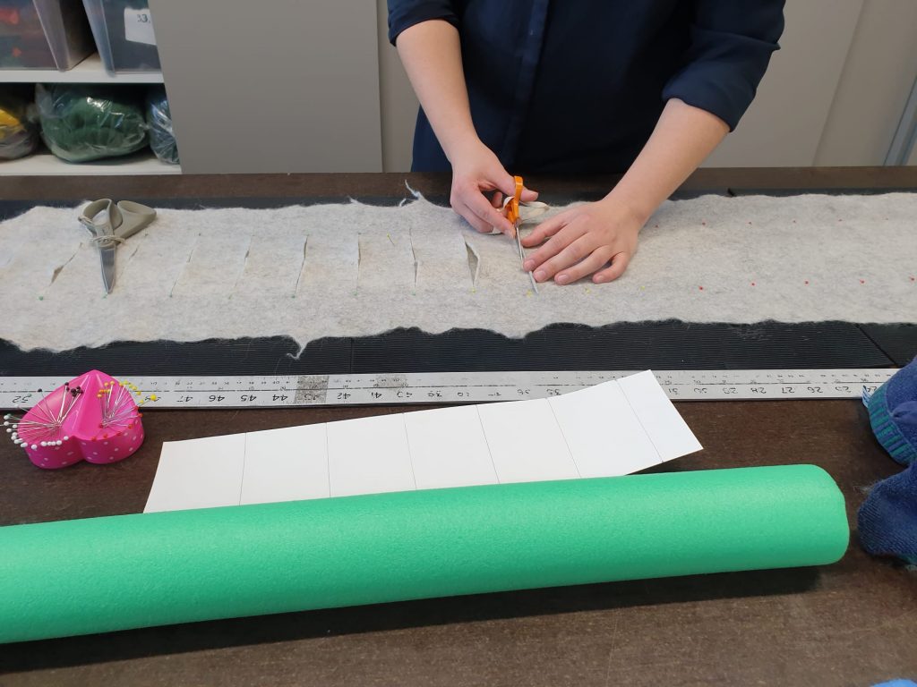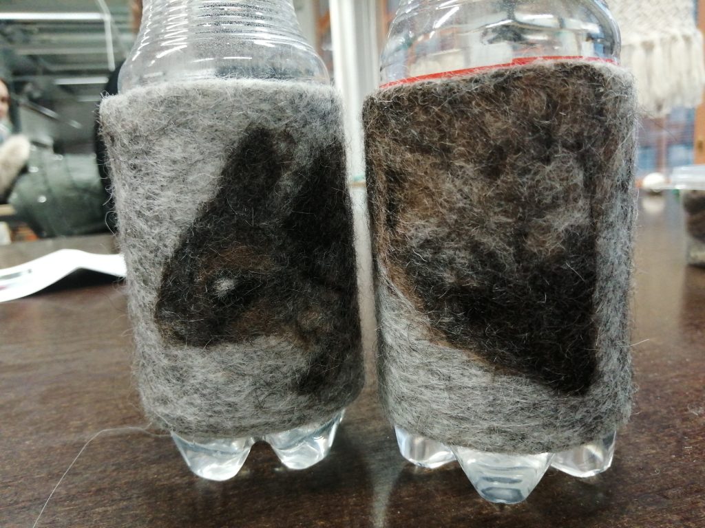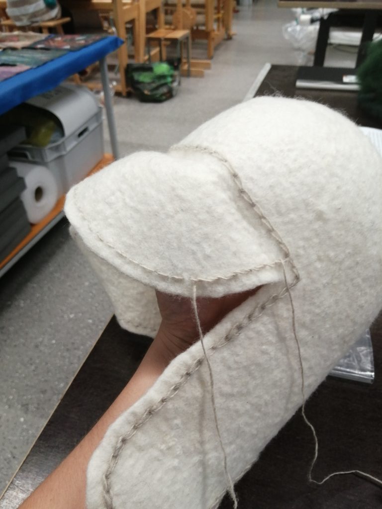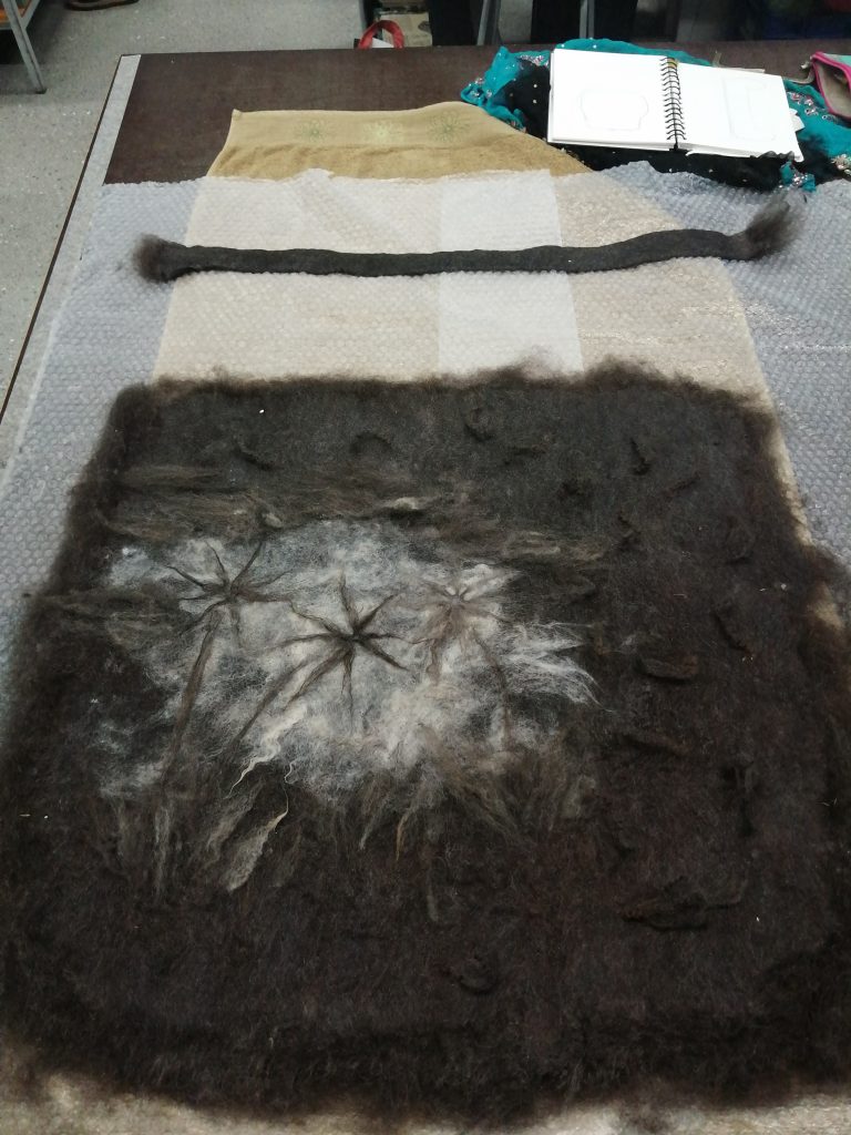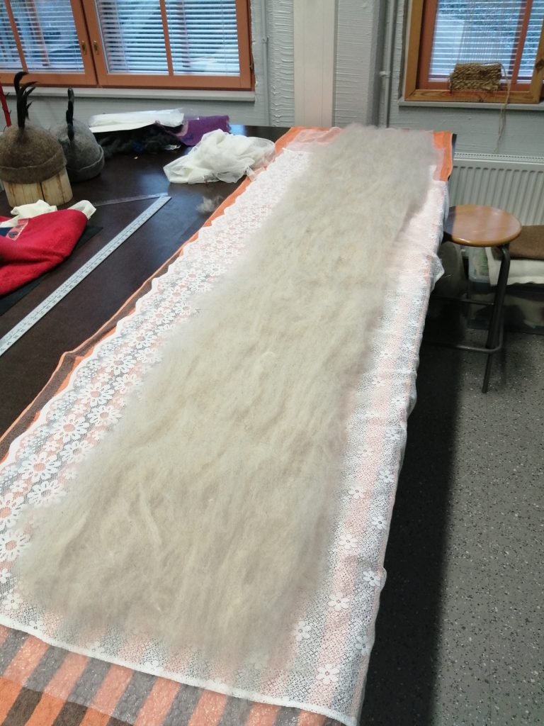 Villa materiaalina on minulle entuudestaan hyvin tuttu omien lampaiden ja kehräämisen myötä. Koulussa huovuttamisen lisäksi tein kuitukokeiluja kotona ja tutkin eri karkeusasteiden ominaisuuksien vaikutusta huopaan ja sen käyttöön.